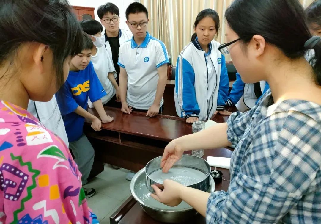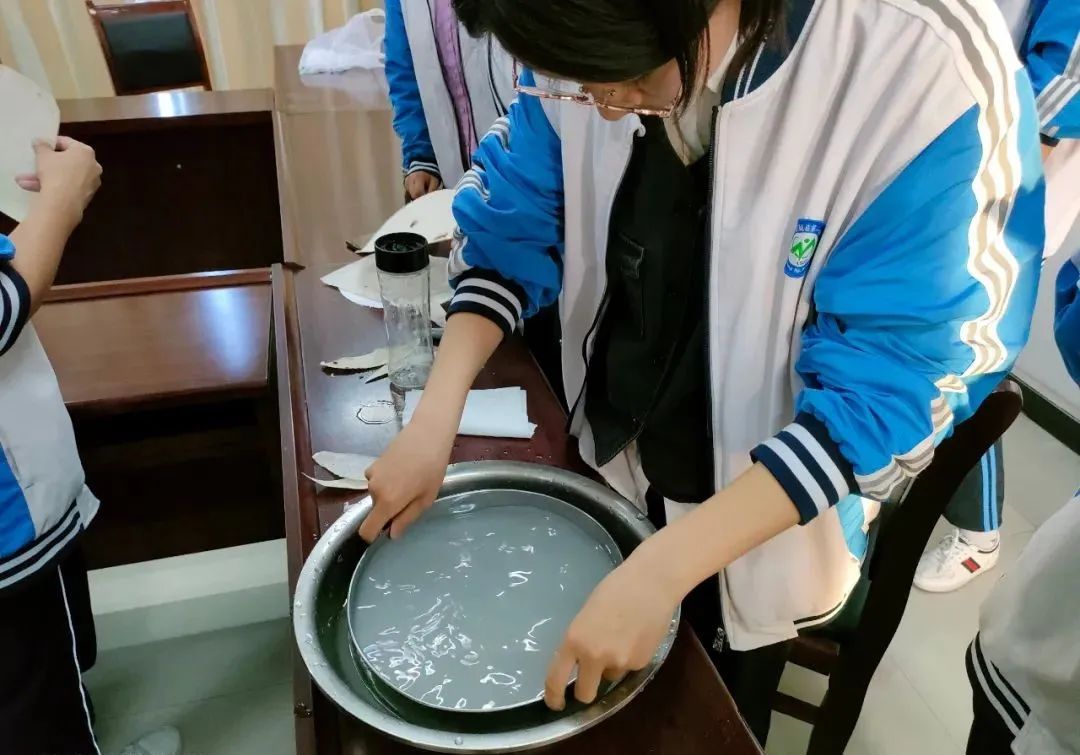 同学们主动尝试,用废旧纸张浸泡、打碎,制成纸浆,简单的工具过滤纸浆,完成再利用,制成草纸。同学们积极尝试,老师在旁边认真指导。