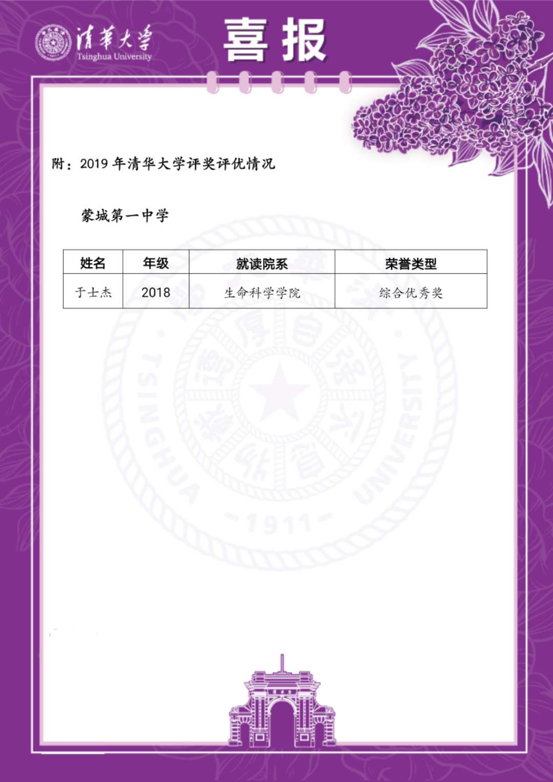 最是一年春好处,满园桃李竞芳菲。在4月20日清华大学109岁生日之际,清华大学向我校发来喜报,对我校多年来一直为清华大学输送优质生源表示衷心感谢,向一中学子在清华的优异表现表示热烈祝贺。据了解,2019年清华大学评优评奖工作中,我校毕业生于世杰同学荣获综合优秀奖。