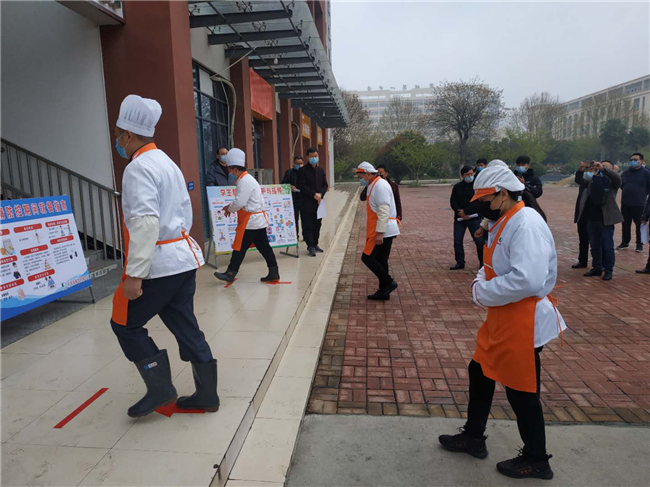 总务科树牢服务师生宗旨意识,主动担当,守土尽责,立足本职、全力以赴,认真进行员工培训,提高认识,提升水平,扎实做好每一个细节,从食材采购,桌椅消毒,入口测温,出口消毒等方面保障就餐卫生。