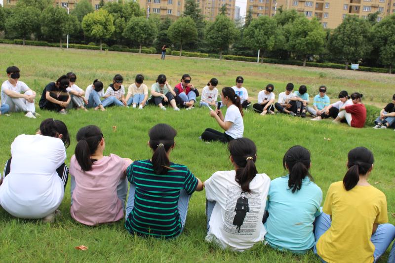 俗话说:“好戏在后头!”最后一个活动是“风雨人生路”,助教老师给每位同学发了一个眼罩,戴好之后,同学们双手放在前面同学的肩膀上,组成了一条“长龙”,跟在牛老师的身后开始了今天的探索之旅。同学们向前缓慢地走着,班主任郭老师依然忘不了给大家唠叨着:从同学们高一入校军训那天起,大家学习与生活中的点点滴滴被老师娓娓道来……同学们听着、走着、感动着!