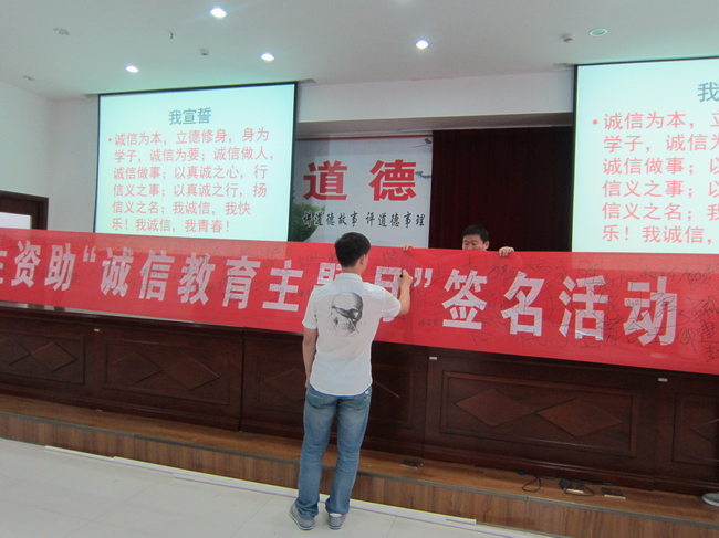 5月26日下午课外活动,蒙城一中在校一楼报告厅举办诚信宣誓、签名活动。参与这次活动的主要有高一年级、高二年级各班的资助宣传员和部分受资助的同学。蒙城一中学生资助办公室副主任孙帮永主持活动,副校长王超发表了重要讲话,给同学们讲解了诚信在生活中的作用和意义,并希望同学们养成诚信的习惯,懂得感恩,传递爱心。同学们纷纷表示,会时刻严格要求自己,树立诚信个人形象,坚持诚信处事原则,端正诚信求知态度,最后,同学们集体宣誓,并在条幅上神圣地签上自己的名字。