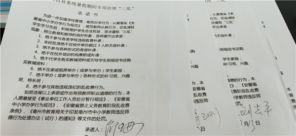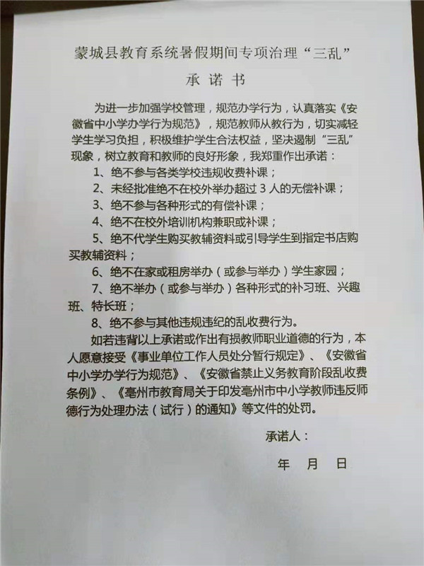 规范办学,治理教育“三乱” 来源:本站原创 作者:张士锋 发布时间:2019-07-13 17:45:40 浏览次数: 次 字体:小 大 打印 分享到: 7月13日下午四点,蒙城一中召开散学典礼大会。学校全体领导和教职工参加了会议。 会上,政教科郏勇科长带领大家学习了县教育局文件,规范办学,治理教育“三乱”,号召大家严守师德,廉洁从教,做四有好老师。 会后,全体教师签署了承诺书。 扫一扫在手机打开当前页