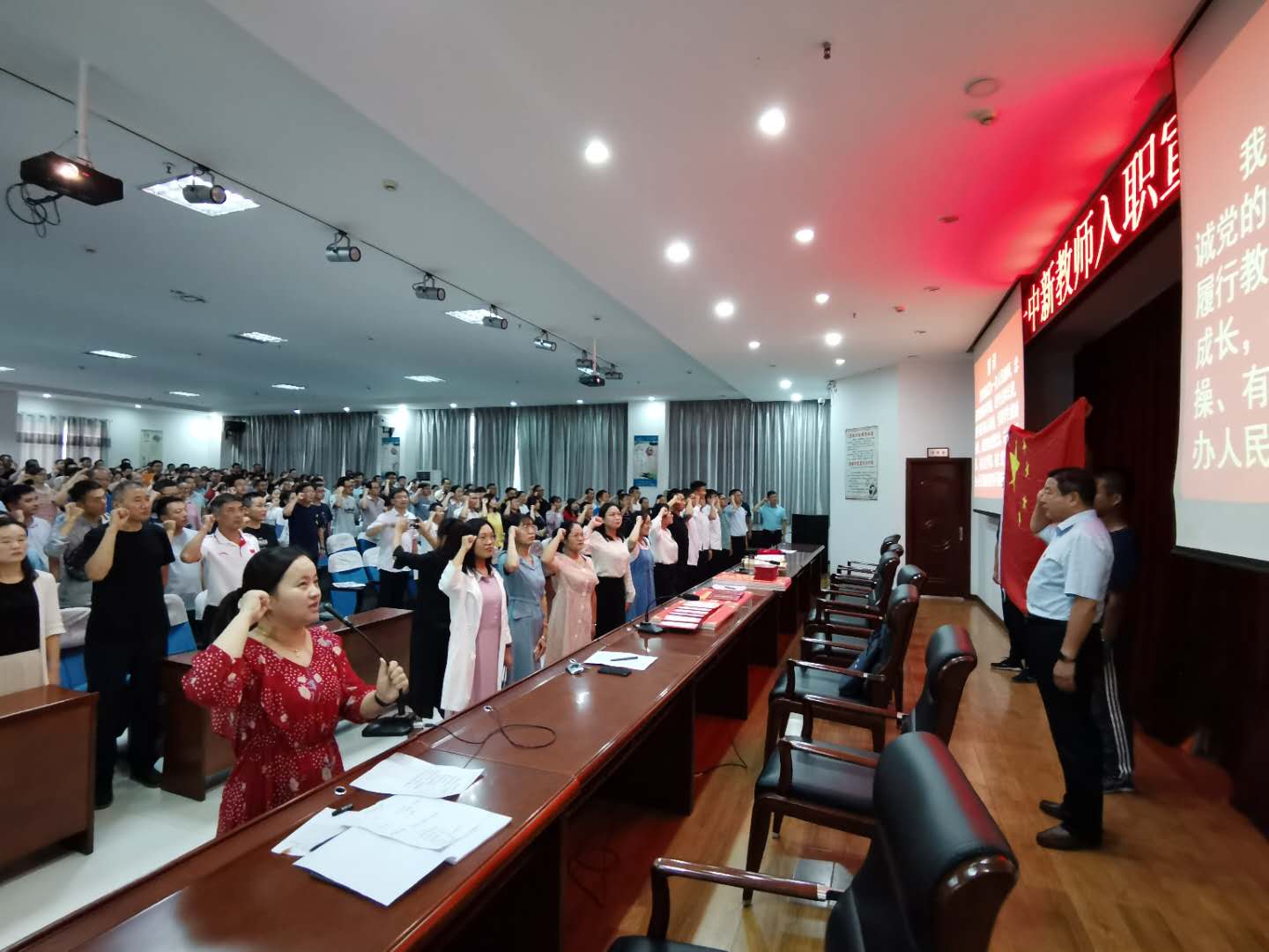 为强师德、铸师魂,进一步加强教师队伍建设,引领广大教师用实际行动践行“弘扬高尚师德,潜心立德树人”的职业操守,增强教师的历史使命感和社会责任感,打造一支政治坚定、师德高尚的党和人民满意的高素质、专业化、创新型的教师队伍,2020年9月14日下午,蒙城第一中学在学校报告厅举行全体教师宣誓活动。