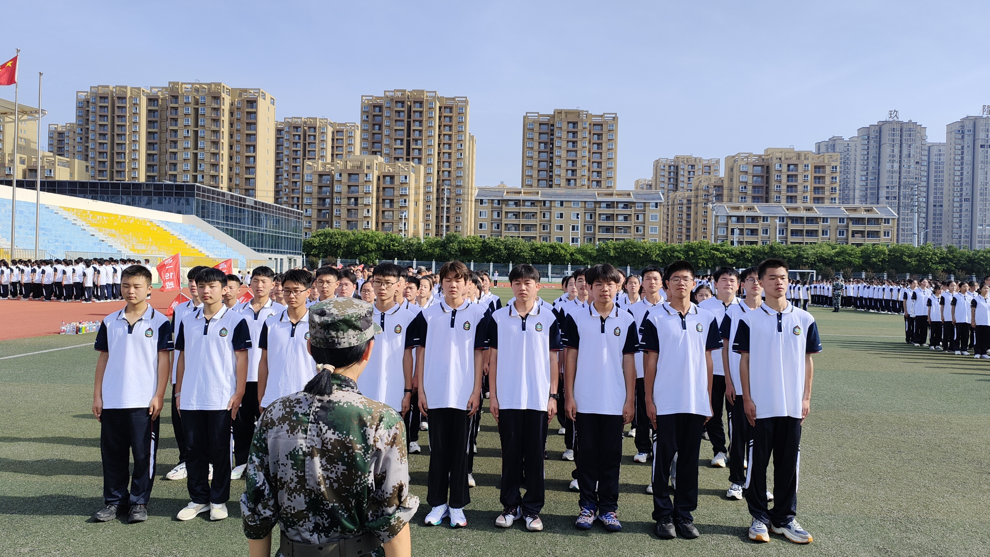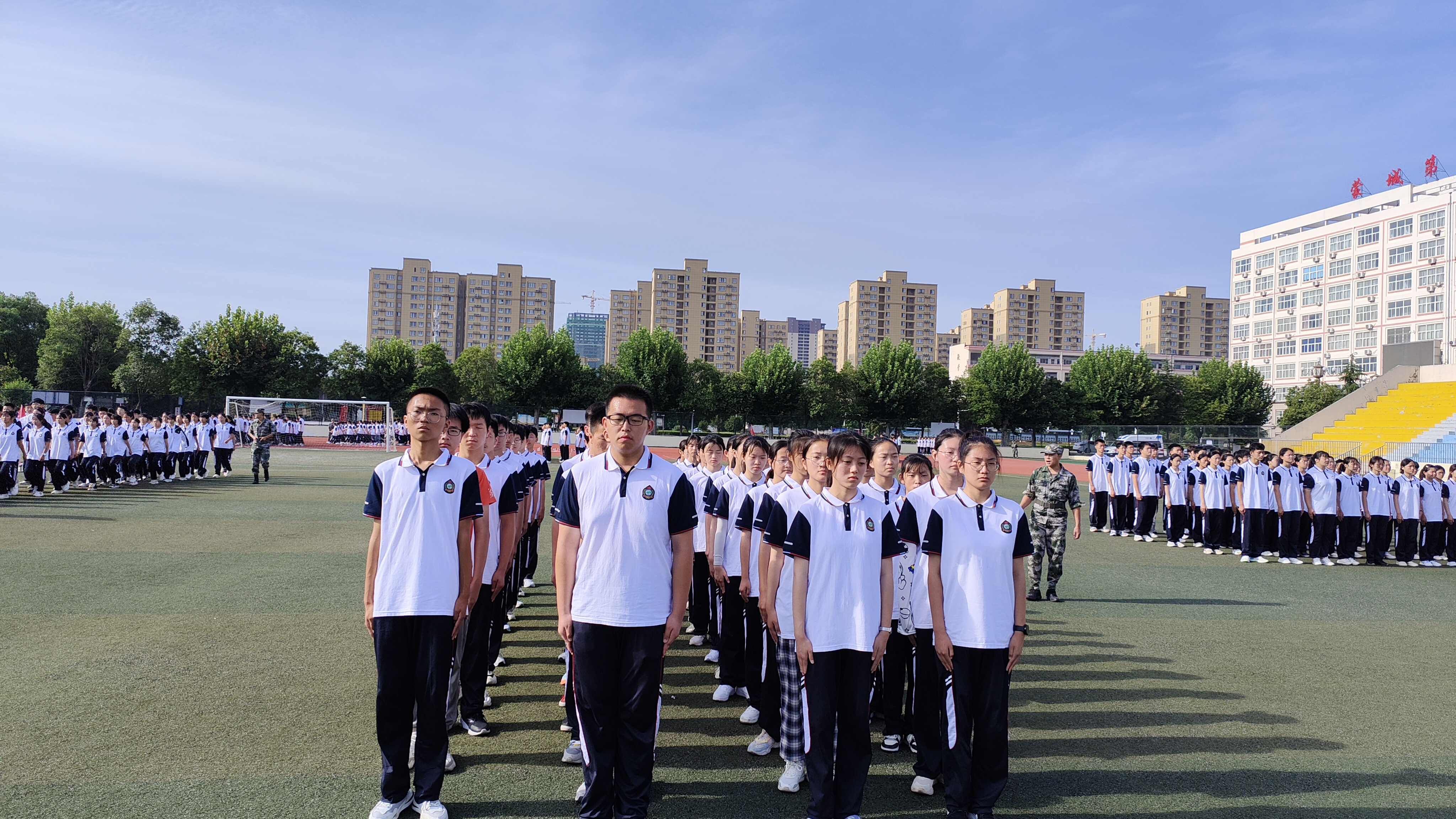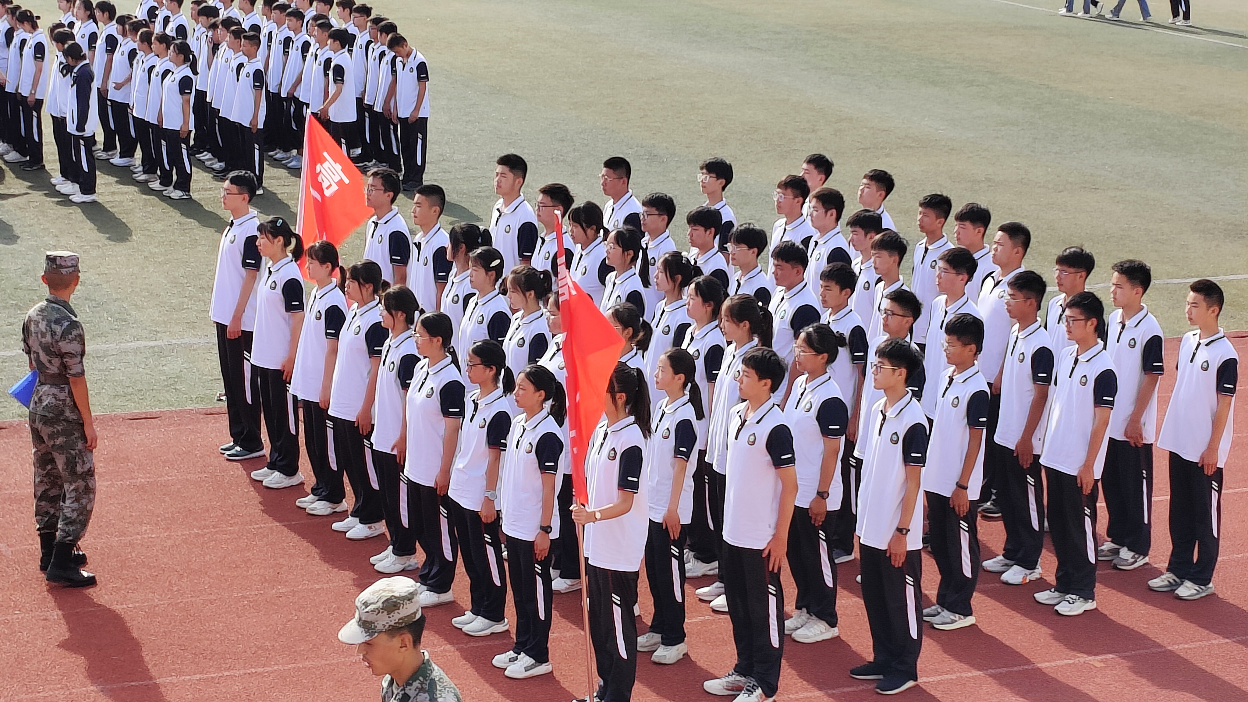 蒙城一中2022级高一新生军训简报(第三期) 发布时间:2022-09-30 10:30:37 浏览次数: 次 字体:小 大 打印 分享到: 2022级高一新生军训活动已进行至第3天,同学们热情高涨,继续走进训练场进行军训操练,立正、稍息、蹲下、站军姿、向右看齐、向前看、向右转、向左转、向后转、跑步走、敬礼、礼毕,同学们抓住动作要领,认真做好每一个动作。通过标准的队列训练,同学们既可以亲身感受并切实体验现代军人整齐划一和严格正规的队列生活,更能培养良好的身姿,建立良好的时间观念、组织纪律观念、集体观念和讲求规范、雷厉风行的作风。 扫一扫在手机打开当前页