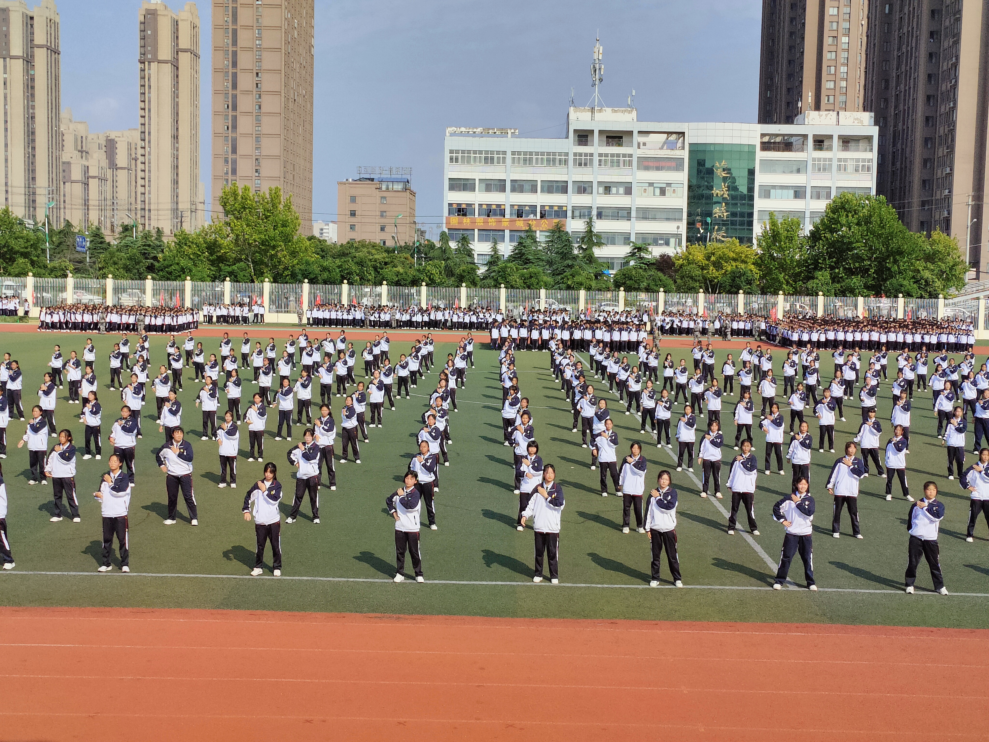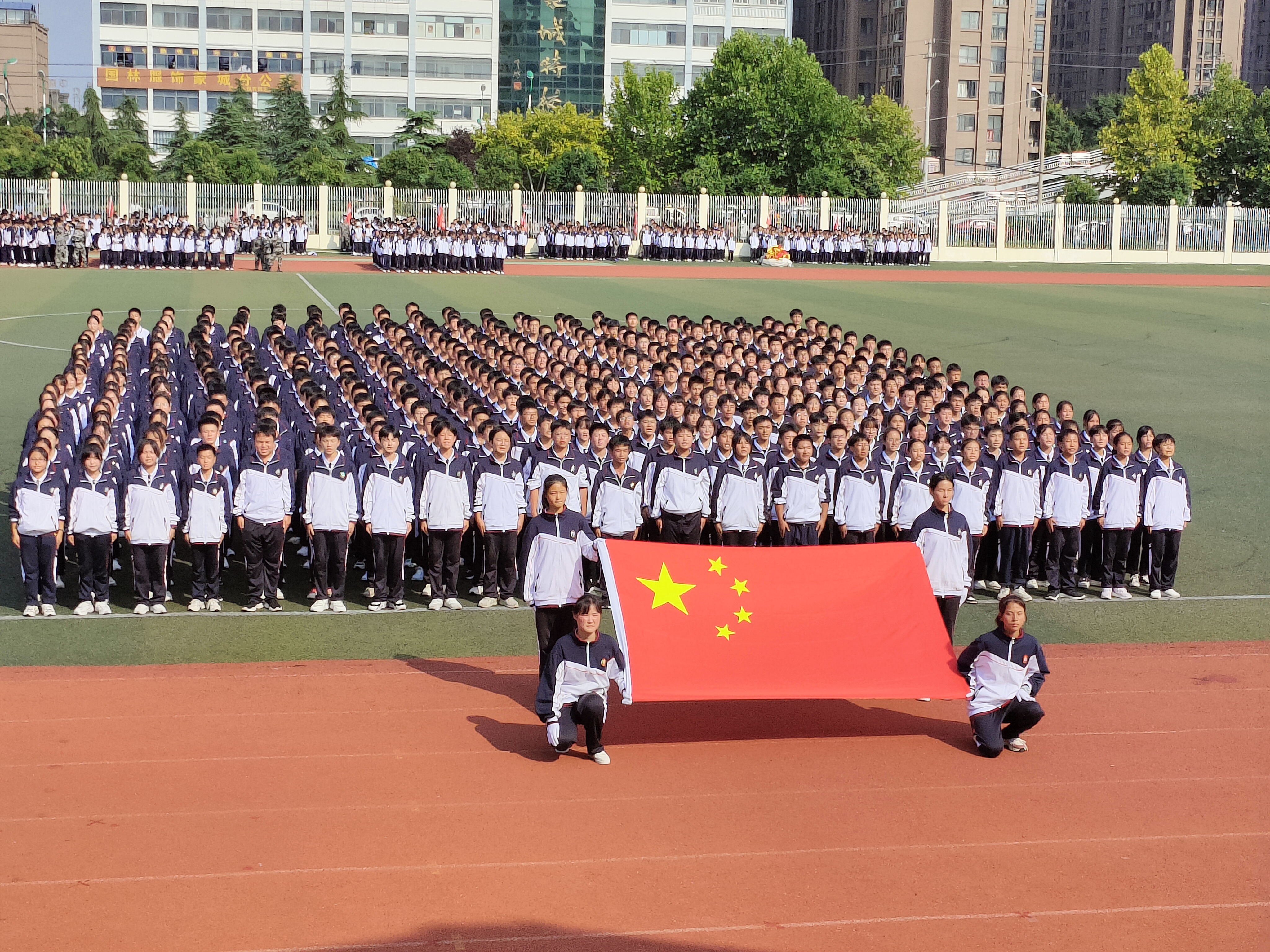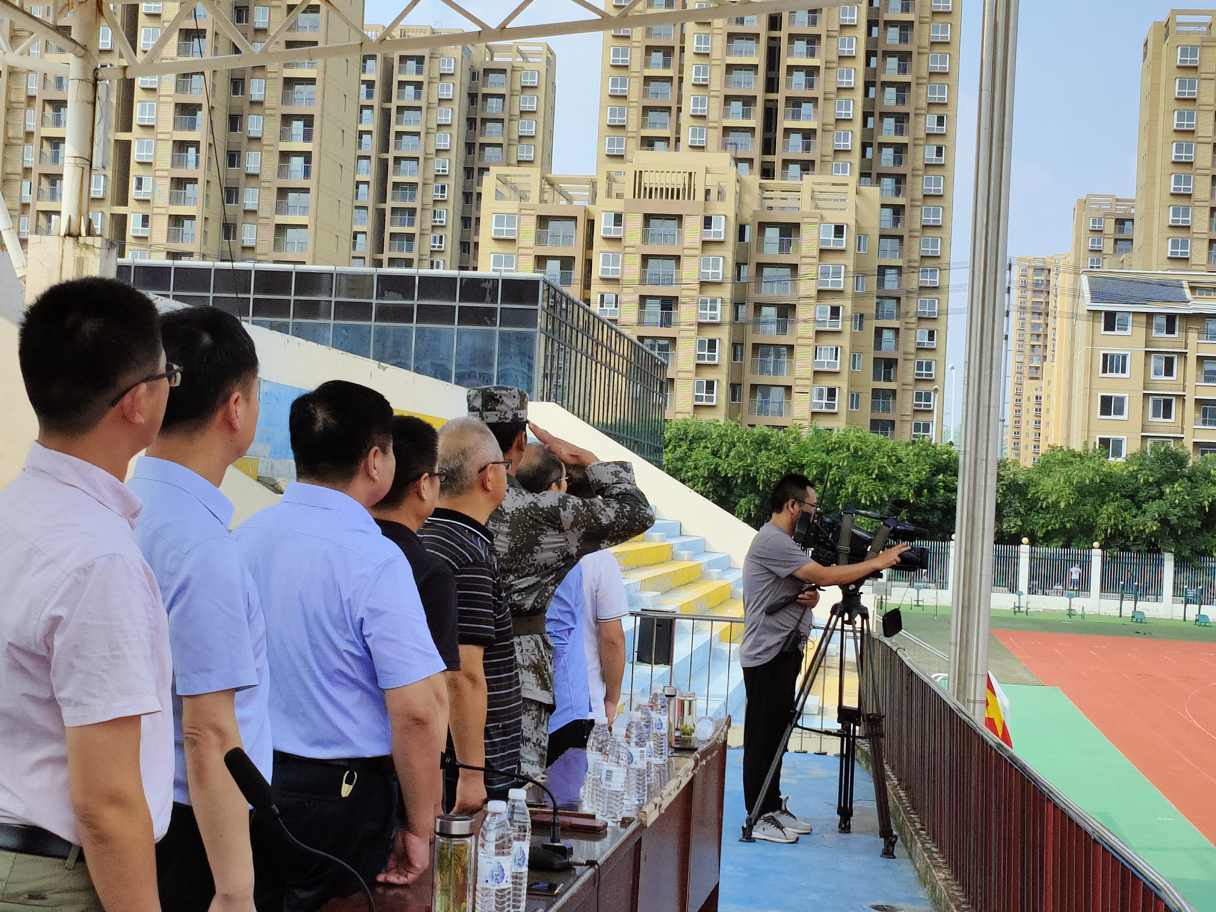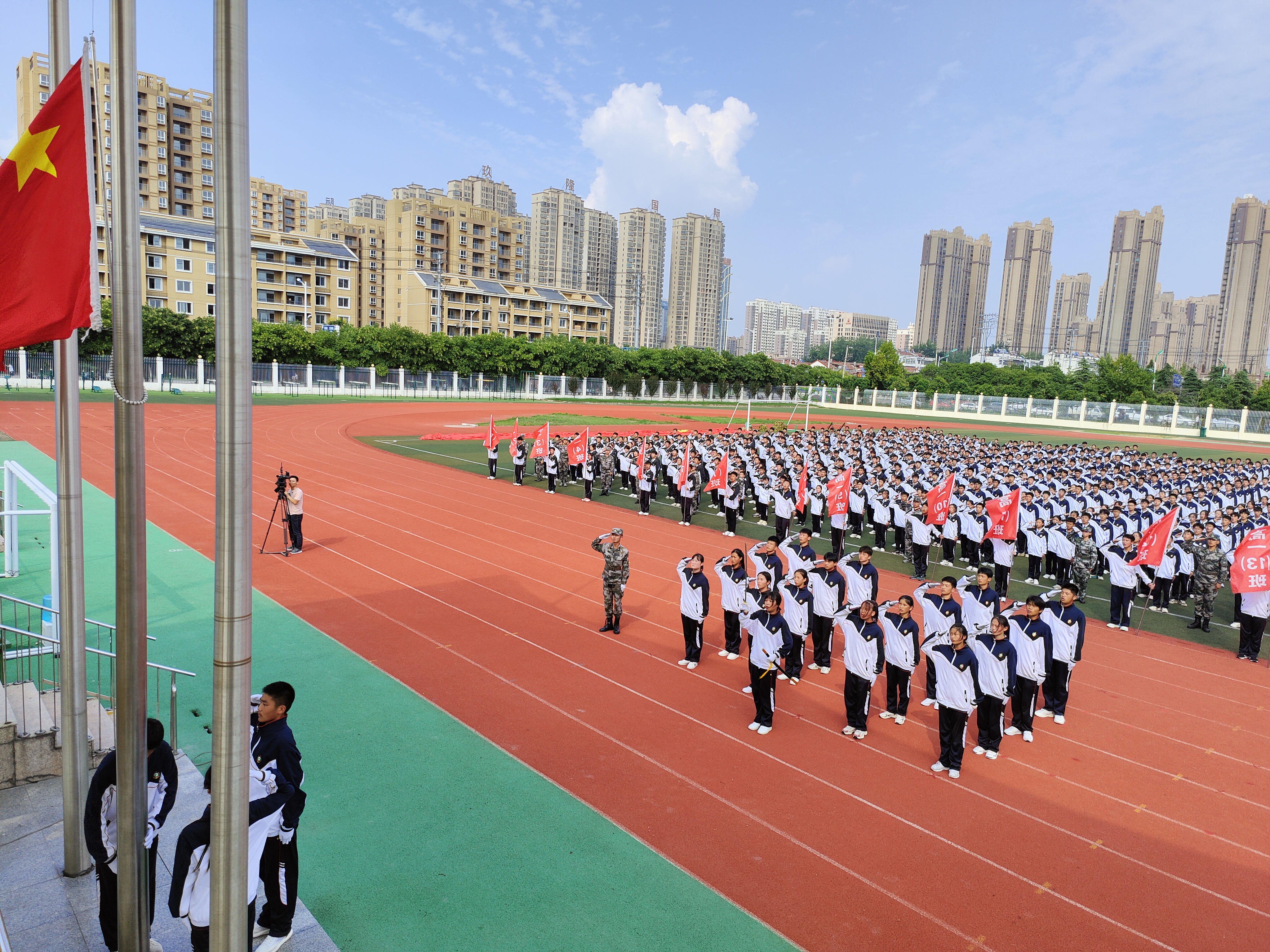 升完国旗后教官队长请示校长,蒙城一中党委书记、校长杨景泰批准同意军训总结汇报大会开始。