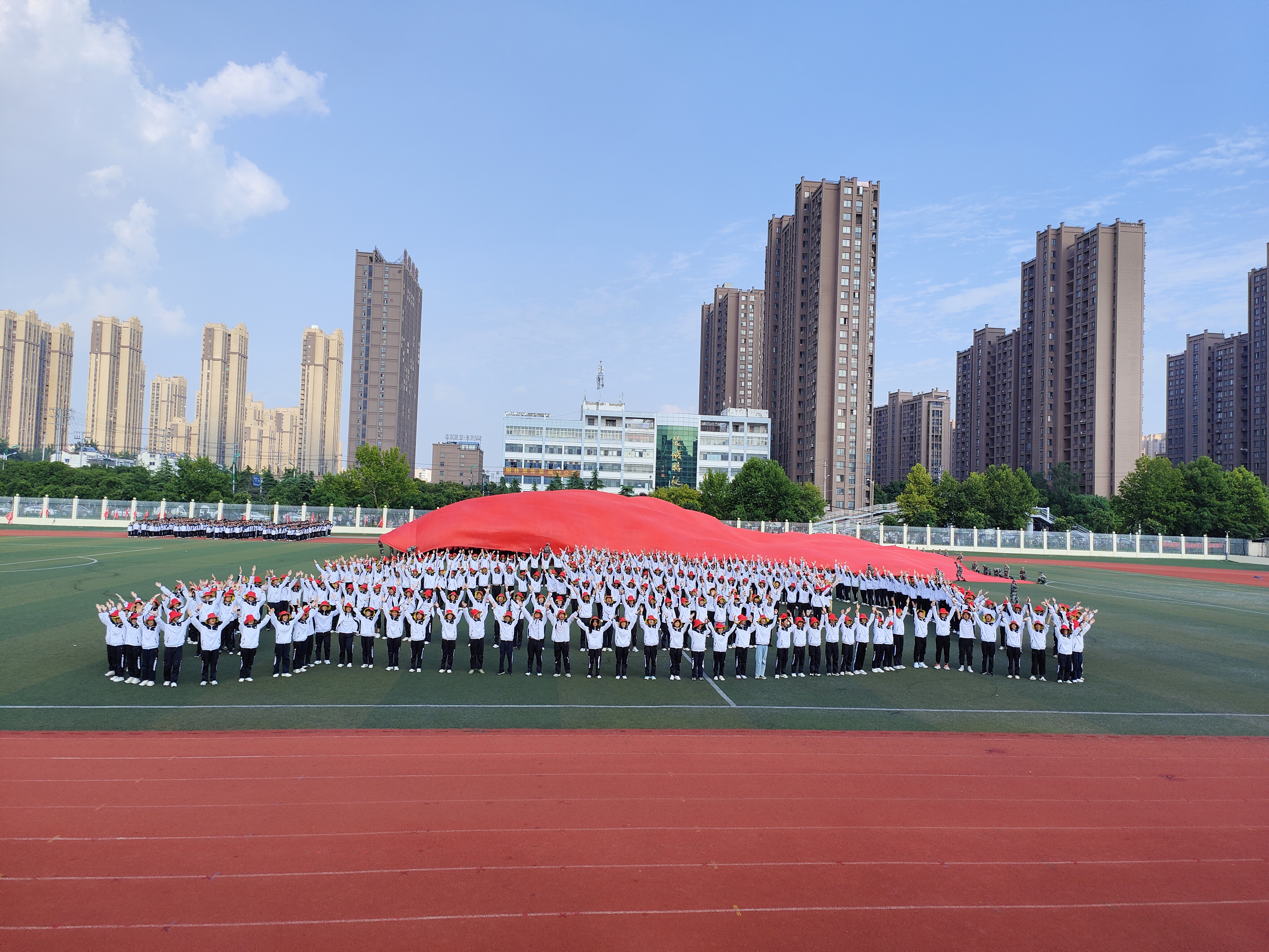 伴着国歌的奏响,同学们深情地唱着国歌,其他人员行注目礼。