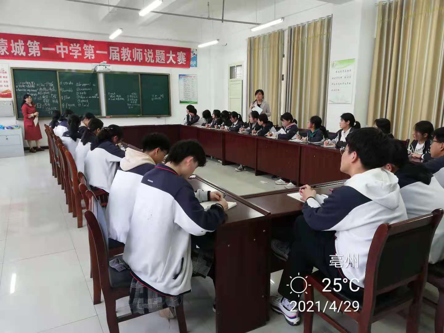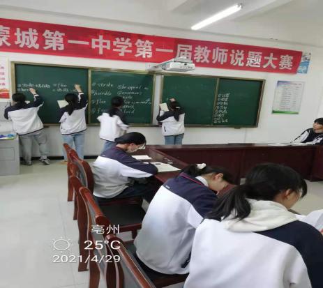| 过程:4月29日下午5点 45布置活动现场 5点50学生入场签到 5点55至6点05分 学生观看视频 6点05分至6点15分学生积极参与词汇竞答 6点15至6点25辅导教师讲解并点拨 6点25分活动圆满结束 | |||