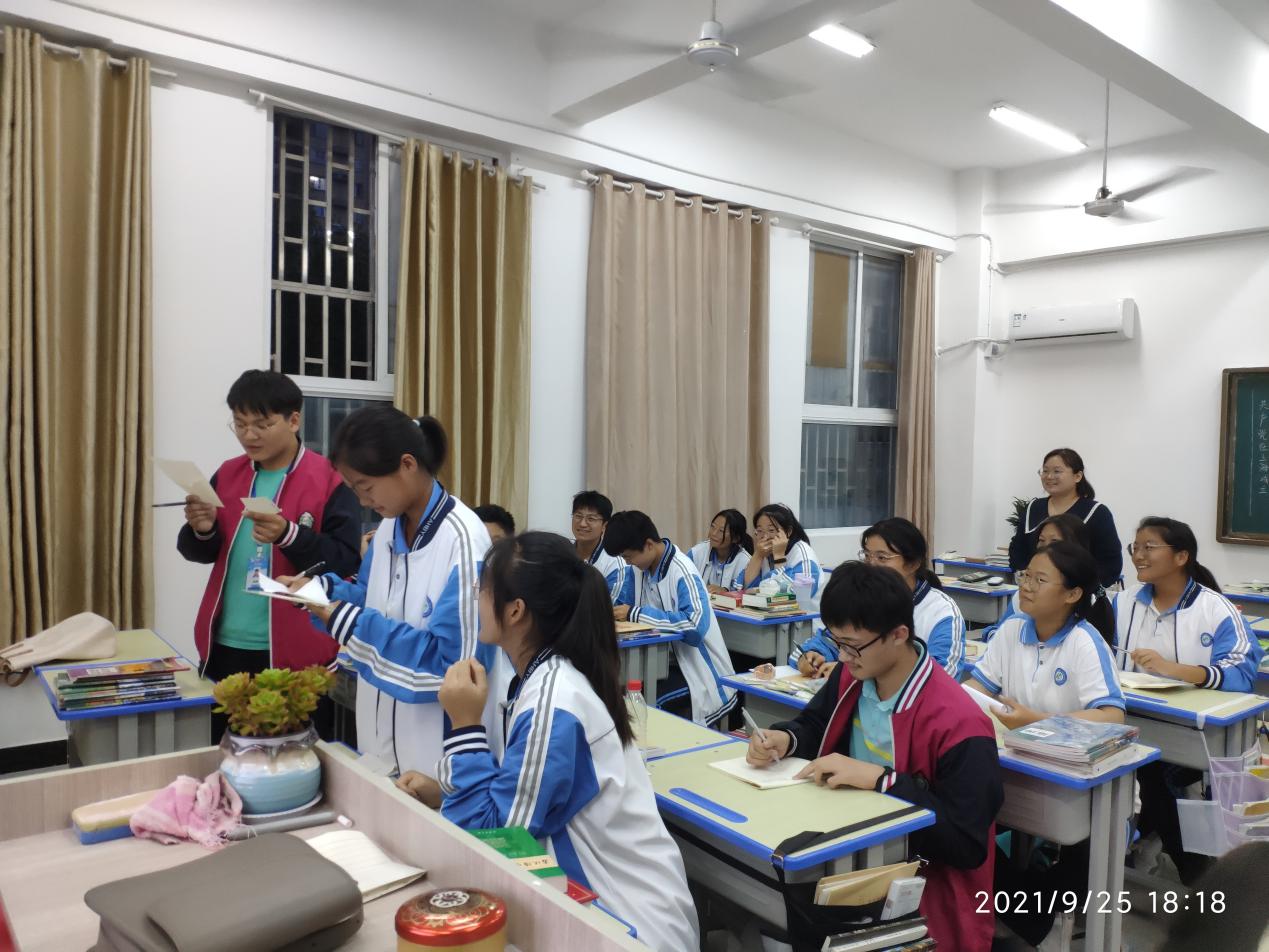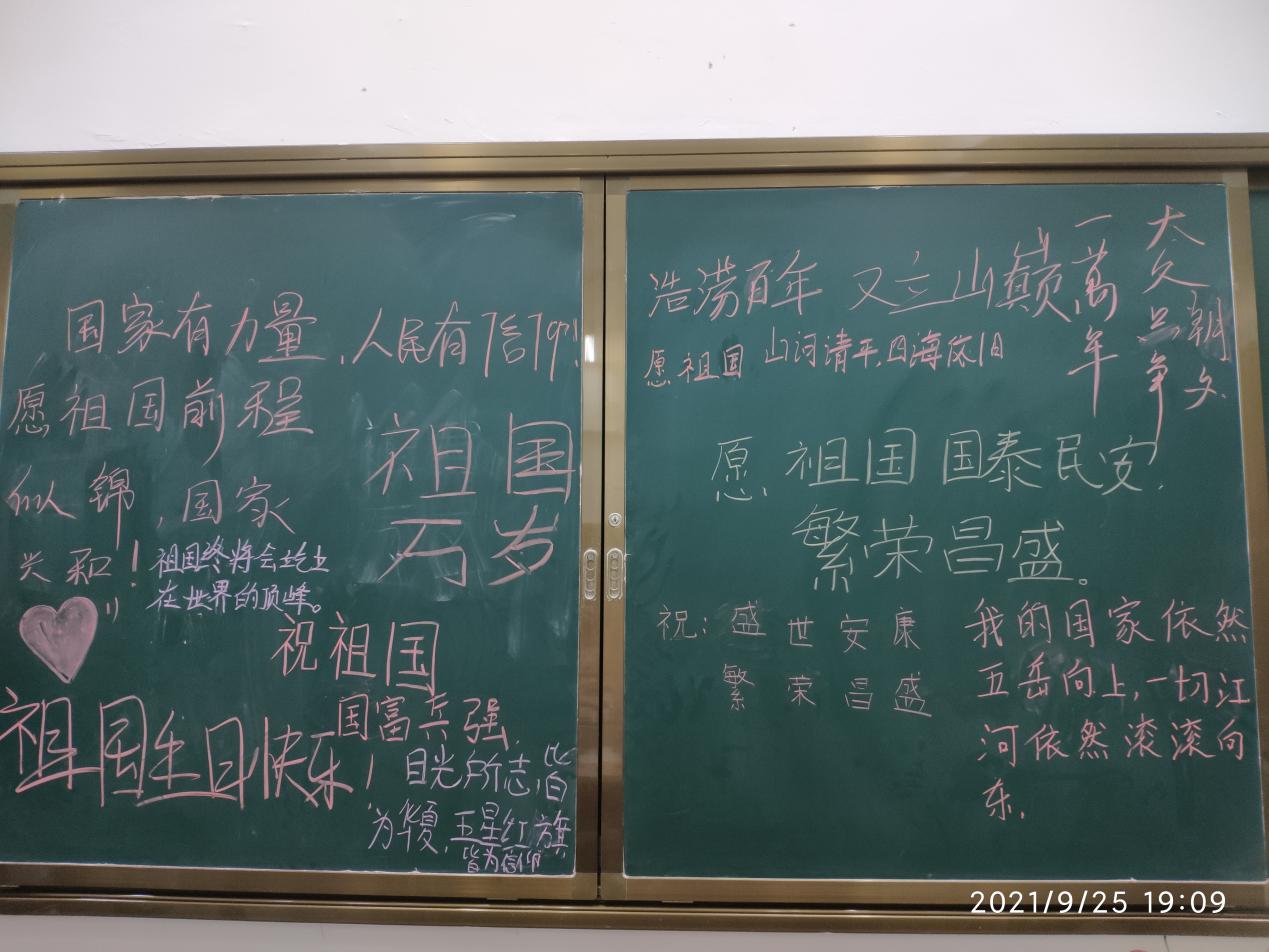 (备注:活动照片至少6张,其中要含有指导老师开展活动的照片。照片也可以另附发到群里) | 过程: 五点五十分,三位指导教师布置教室、准备设备。王瑞雪老师制作并展示课件,刘雅静老师布置会场、准备小礼品,程拢拢老师做开场白和结束语以及活动串词。 六点,学生陆续到场,并有序签名。 六点五分,教导教师对社员分组并介绍活动过程,后正式开展“享祖国盛世,展青春才智”。 活动过程: 环节一:词语接龙 六组学生抽签决定接词格式和比赛顺序 两两对抗,分别采用ABB,AABB,ABAC格式,胜出队伍奖励小礼品,失败队伍展示才艺作为小小惩罚。组内队员全面积极参与,气氛活跃,为此次活动开了个好头,学生的热情也被很好的激发出来。 环节二:知识竞答 本环节以小组为单位采取举手竞答方式,答对一题积一分,分数最高的小组获得奖品。知识竞答题分为填空题、问答题和选择题,以新中国成立以来发生的重大事件和取得的巨大成果为主要内容,并辅以文学方面的知识题。这样既能帮助学生了解中国发展历程,感受中国发展速度,增强民族自信心,又能增长知识,提升素养。小组表现积极,争先恐后抢答,场面热闹激烈。 环节三:我手写我心,祝福祖国母亲 伴随着《我和我的祖国》歌曲声响起,同学自发地走上讲台,在黑板上庄严地写下对祖国的祝福语,他们风华正茂,慷慨激昂,书写有力,让我们深深地感受到他们炽热的爱国心。 七点十分,活动结束。师生共同打扫干净教师,关好门窗,有序离开教室。