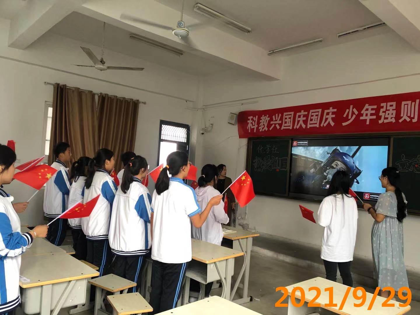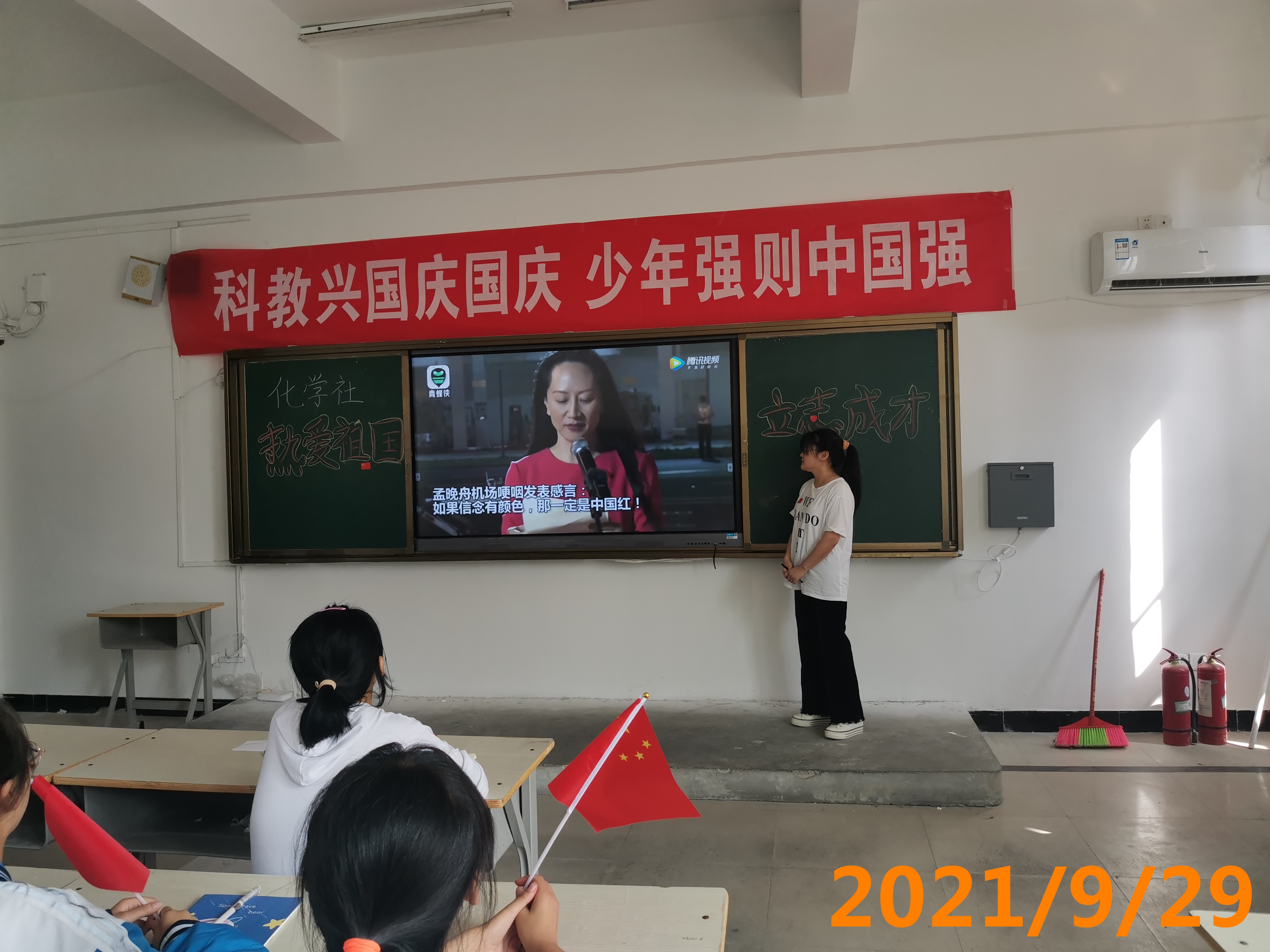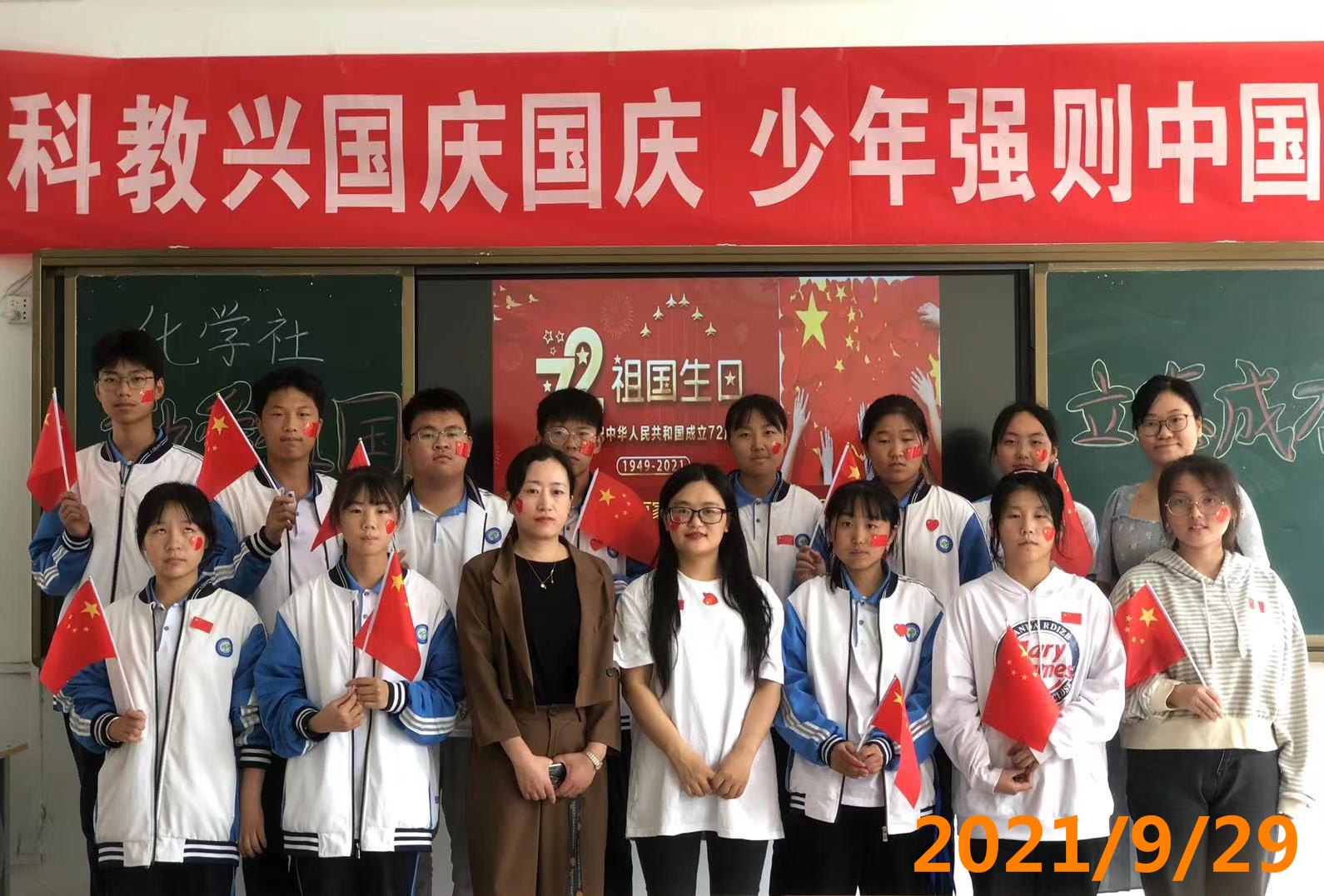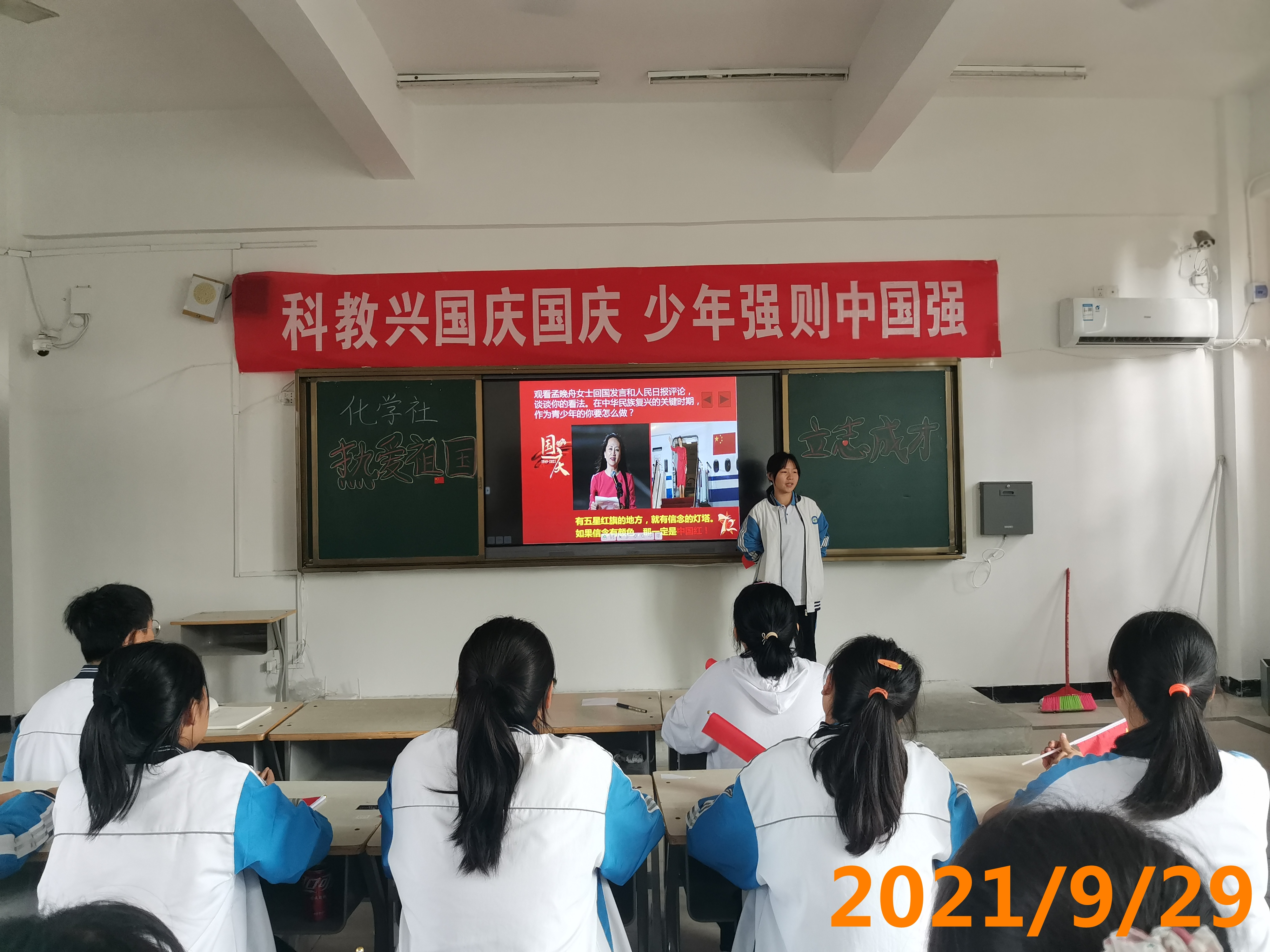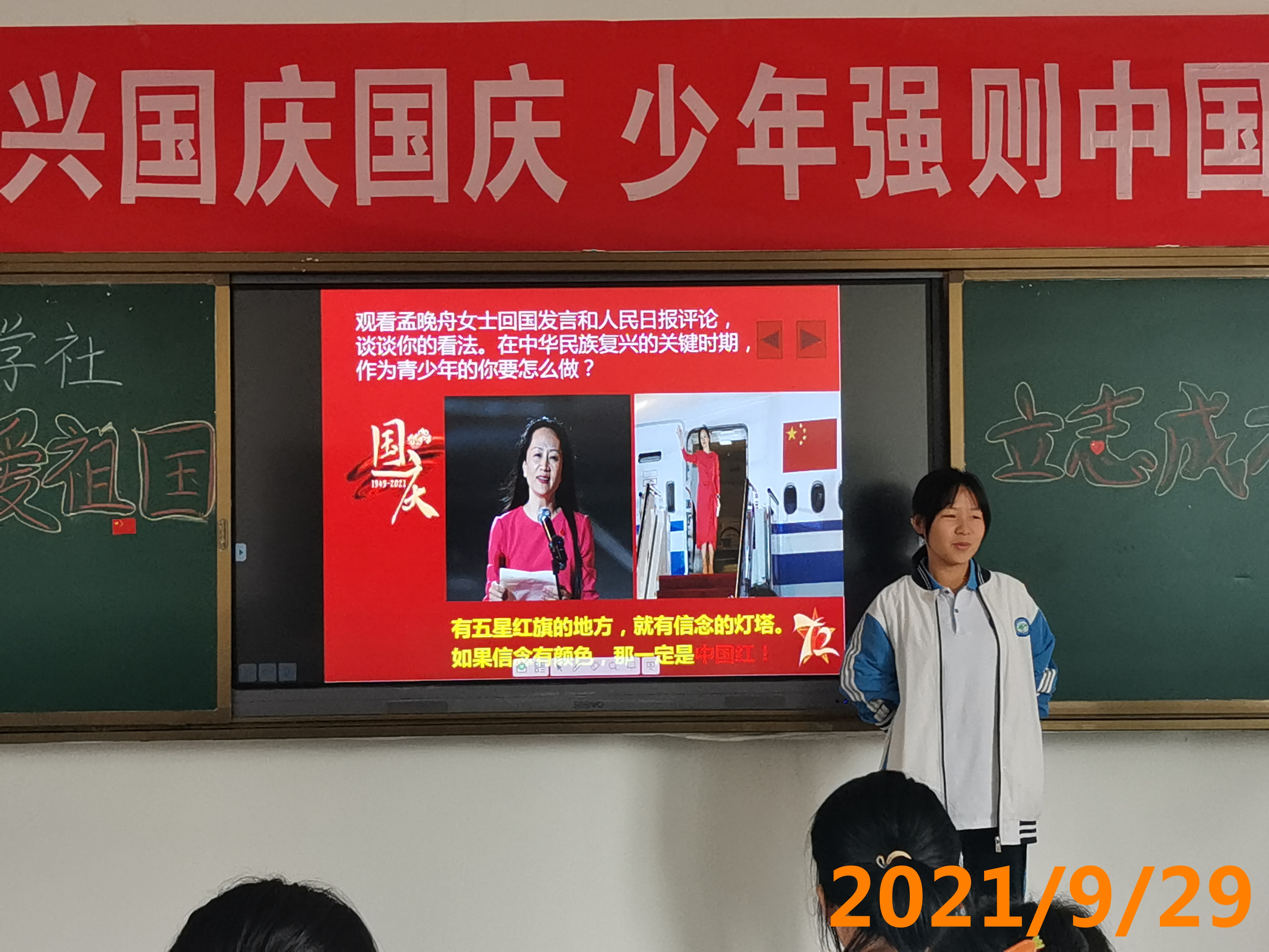 1、 在<<今天是你的生日>>的旋律下,展示中国72年发生的局的变化,1949年中华人民共和国成立,脱贫攻坚,中国实现了从站起来到富起来的转变,现阶段又要向强起来迈进,让学生了解时代的变迁赋予新时期青少年的使命。 2、 《观看孟晚舟回国讲话》和《人民日报评论:没有任何力量可以阻挡中国前进的步伐-》。 3、 学生发言(少年强则中国强,热爱祖国,努力学习,报效祖国。) 4、 主持人归纳介绍中华民族复兴道路上的机遇和挑战,科技与教材和青少年学生的关联。 5、 齐唱<<歌唱祖国>>,祝福祖国72周年华诞生日快乐,繁荣富强。拍照留念。 6、 下期活动预告。