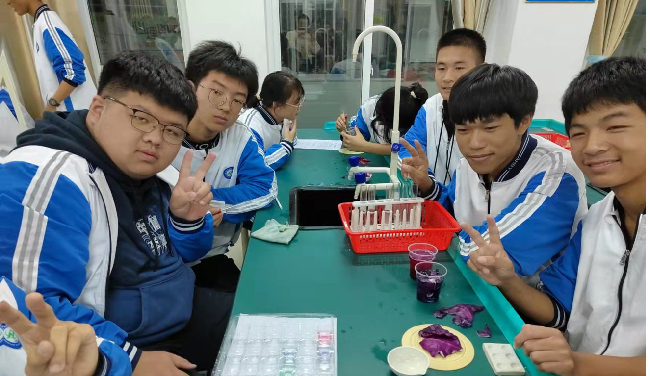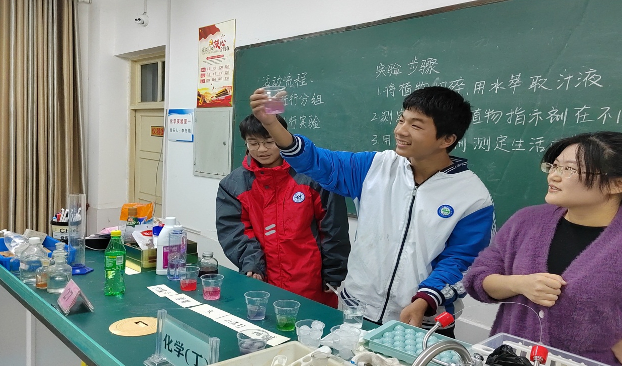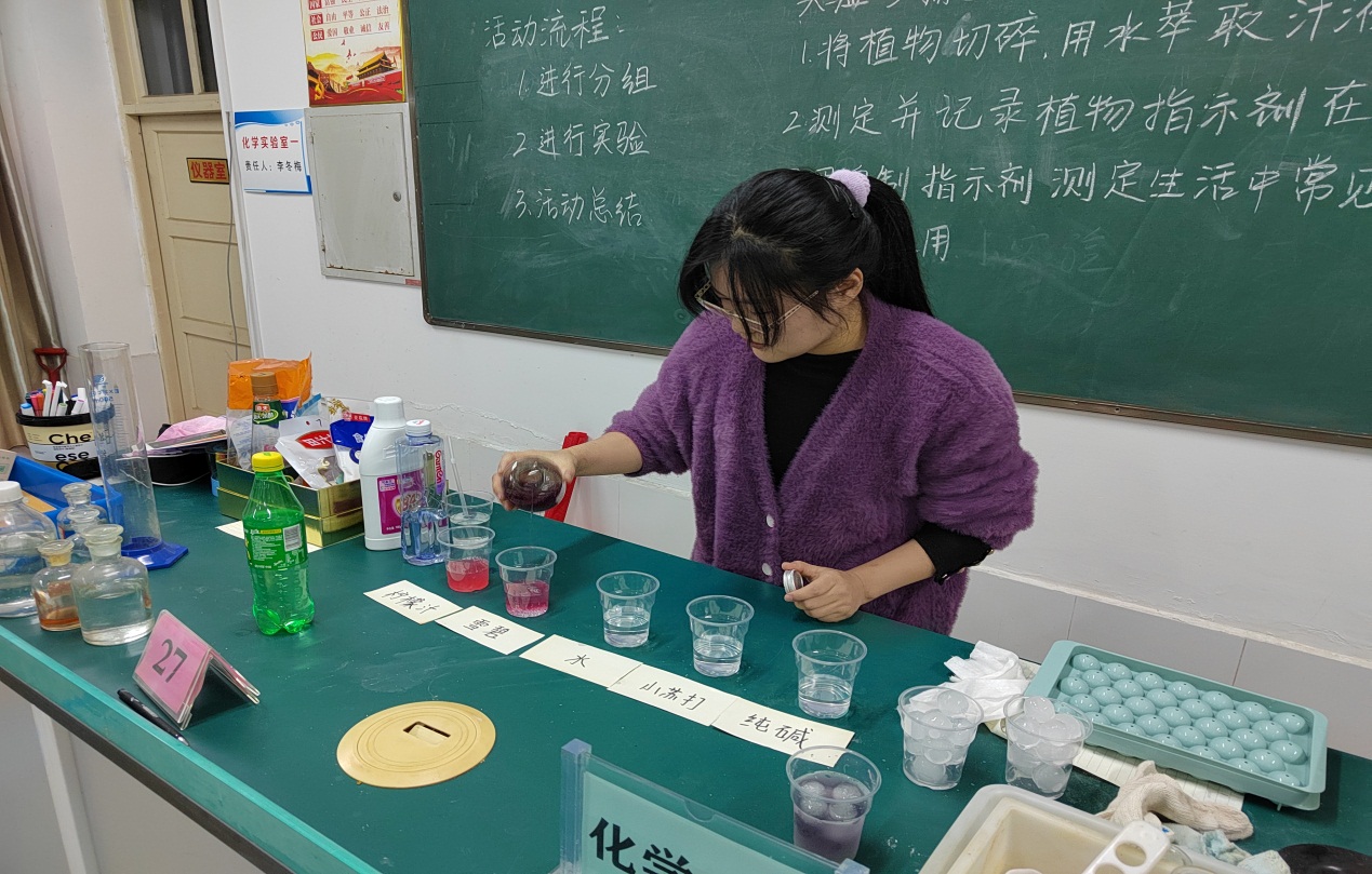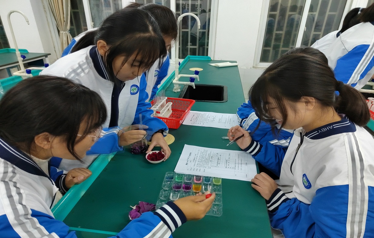 酸碱指示剂,是高中化学酸碱滴定的重要指示剂。为了丰富学生的课余生活,激发学生学习化学的兴趣,加深学生对酸碱指示剂的了解,蒙城一中化学社开展了“遇见色彩:自制酸碱指示剂”社团活动。