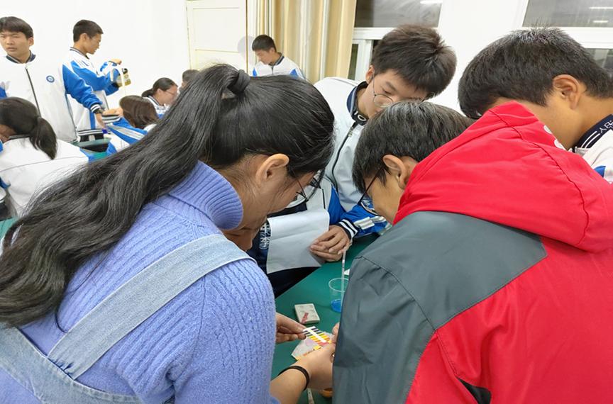 实验中,化学社的辅导教师张慧林、李慧敏、王琳、张燕分组指导学生,完成实验过程,记录小组评价,学生讨论实验报告中的问题,通过讨论,加深了学生对酸碱指示剂的理解,培养了学生运用所学的知识去解释实际问题的能力。