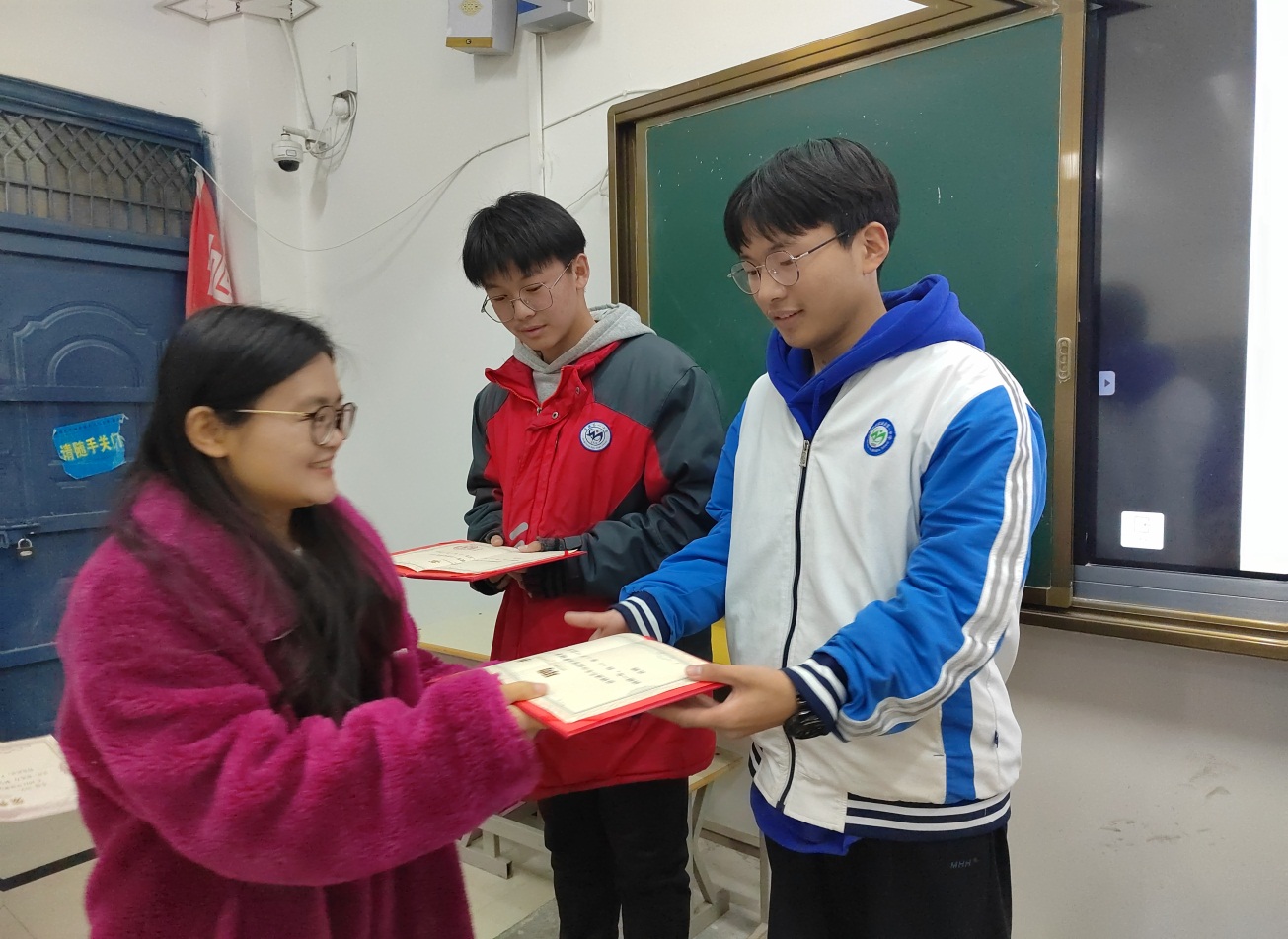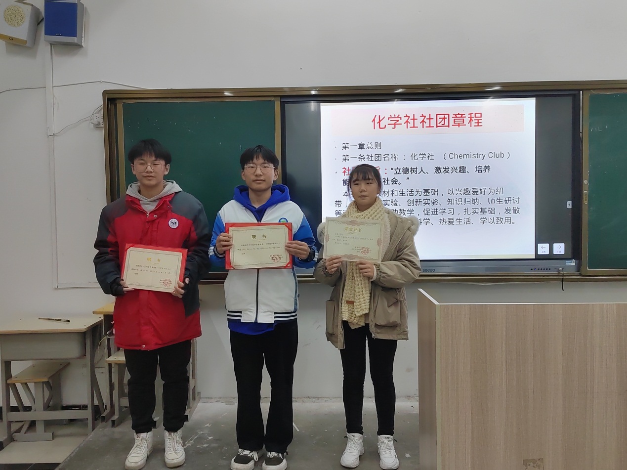 张燕老师为选举出的社长、副社长颁发聘书。