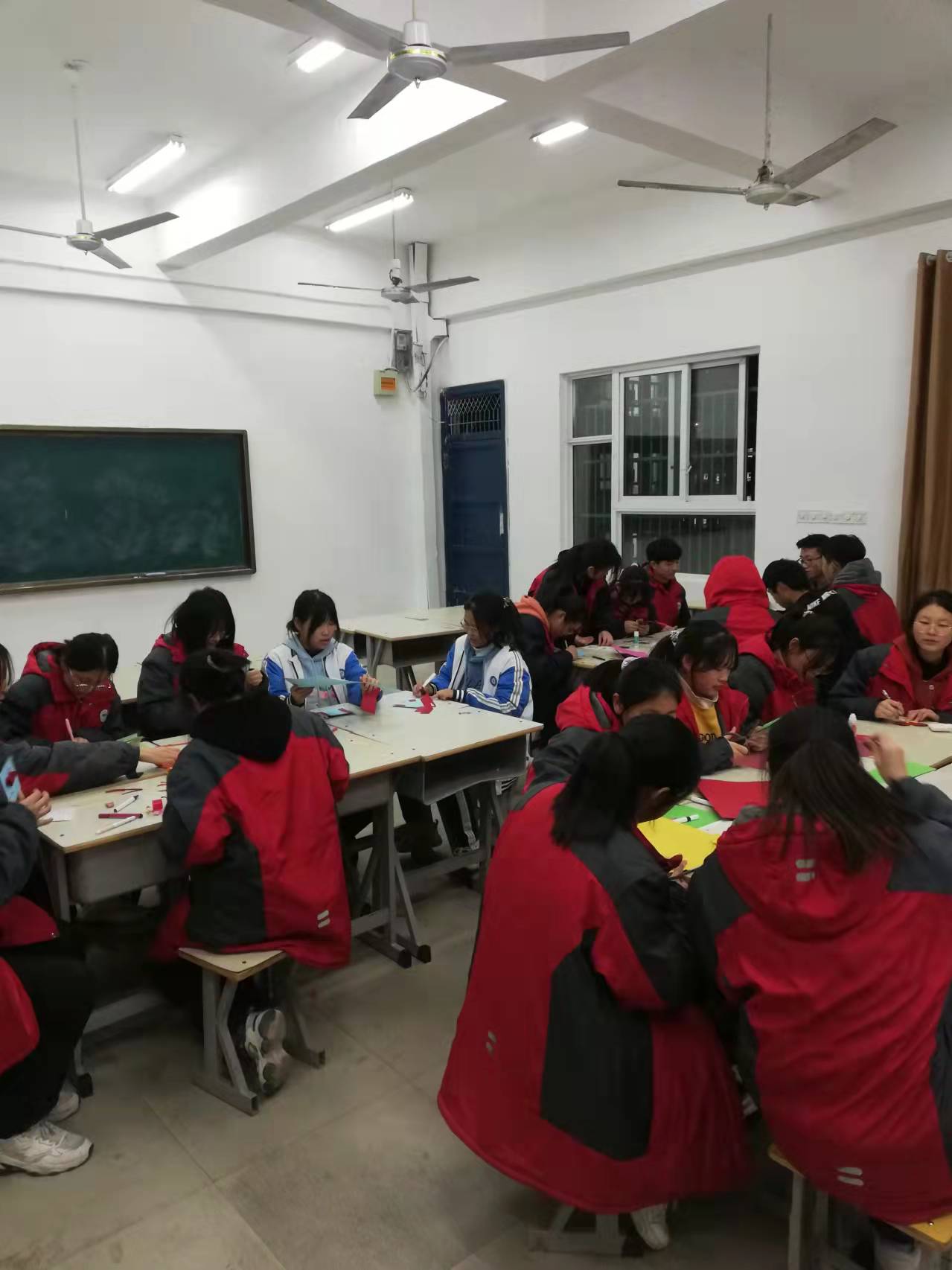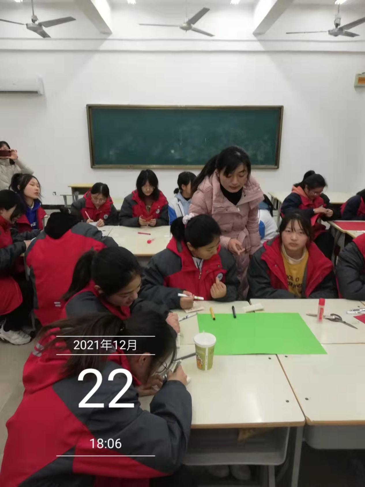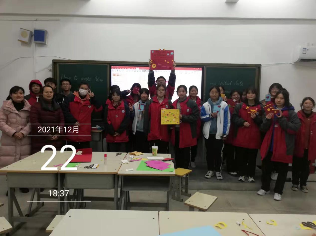 (备注:活动照片至少6张,其中要含有指导老师开展活动的照片。照片也可以另附发到群里) | 过程: 下午5点50分组织学生布置活动场地并按需要分组。 5点55分社团辅导教师孔伟路用《新年快乐》这首歌并和学生问答,引入元旦话题,让学生观看《元旦起源及相关庆祝活动》的视频,结合现时情况引入《做贺卡,寄贺卡》这一主题(包括制作贺卡在内,整个过程用英语)。 6点5分至6点30分辅导教师们开始分发制作贺卡的相关材料并让学生动手制作卡片,并在课件中展示各种贺卡及可借鉴的祝福语! 6点30分至6点33分分组让每组学生展示自己的作品。 6点33至6点35分全体师生在歌曲《新年好》中合影结束活动。
