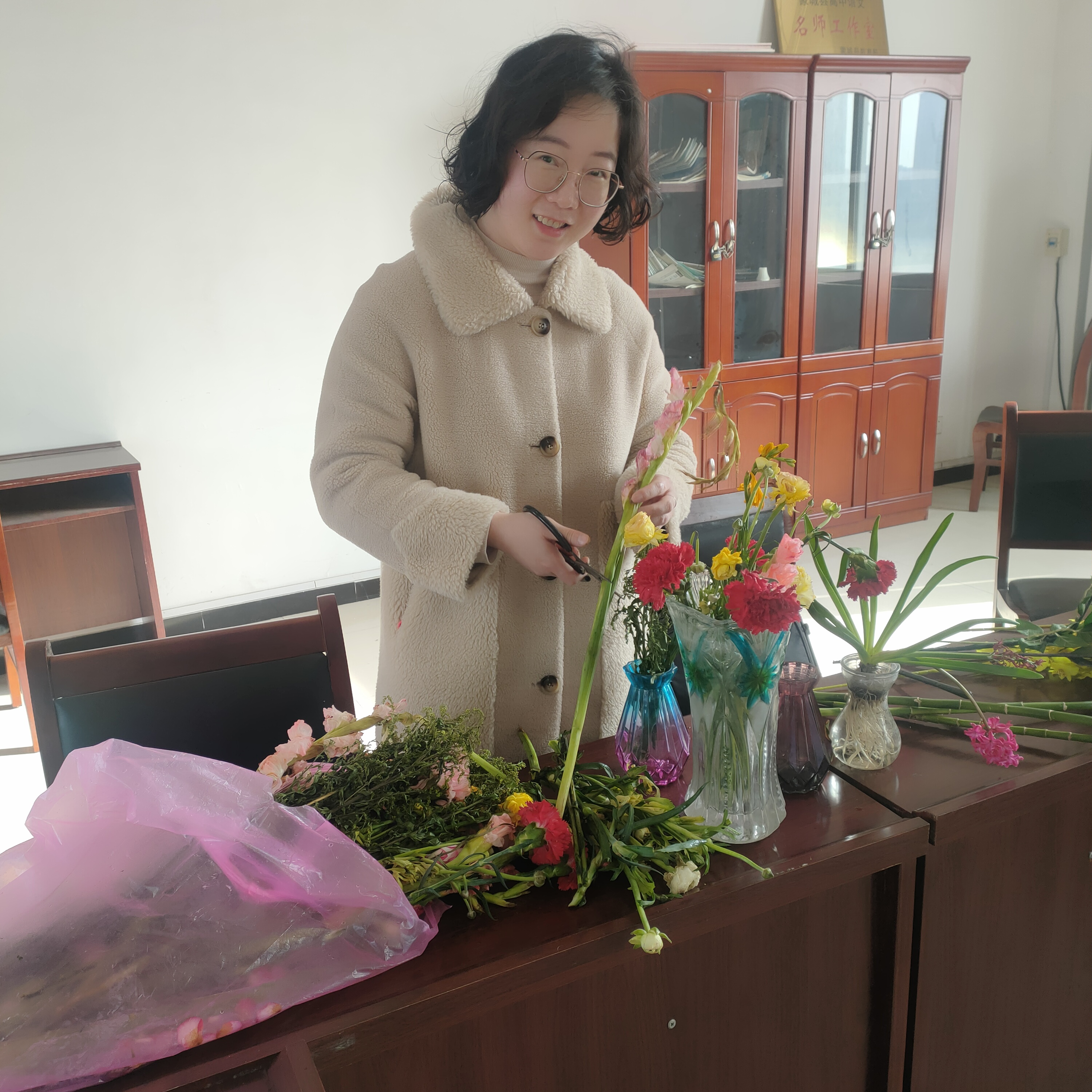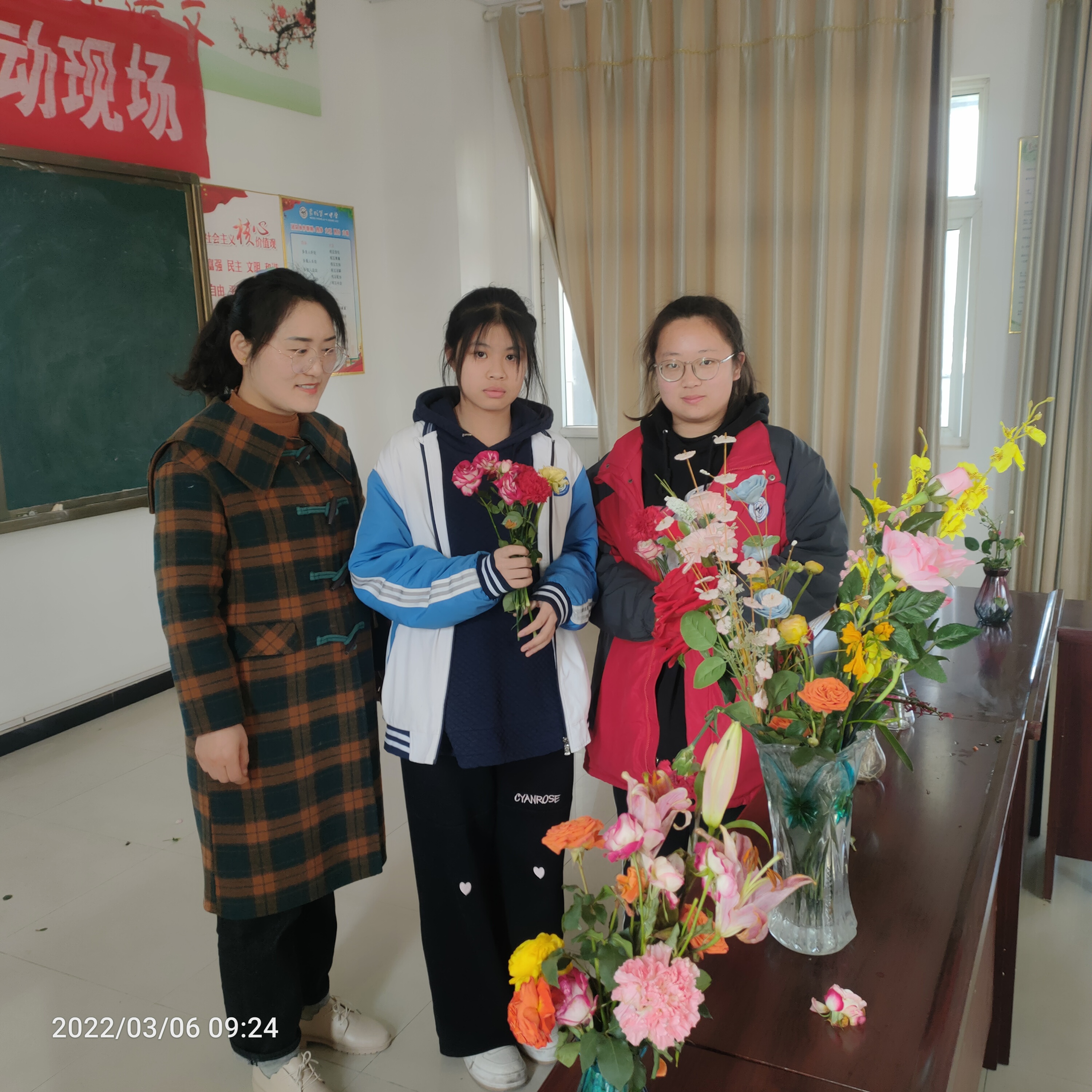 (备注:活动照片至少6张,其中要含有指导老师开展活动的照片。照片也可以另附发到群里) | 过程: 时间:2022年3月6日上午8:30--10:30 1、 樊琳老师负责活动前期策划工作 2、 李晓伟老师提前准备养花、护花、插花的相关知识 3、赵秋怡老师准备相关的教学用品,鲜花、花瓶、剪刀等 4、吕静文老师负责组织学生的签到、纪律、安全等工作 5、8:30,李晓伟老师给学生讲解插花知识 6、吕静文老师指导学生剪花、插花 7、赵秋怡老师总结此次活动的意义 | ||