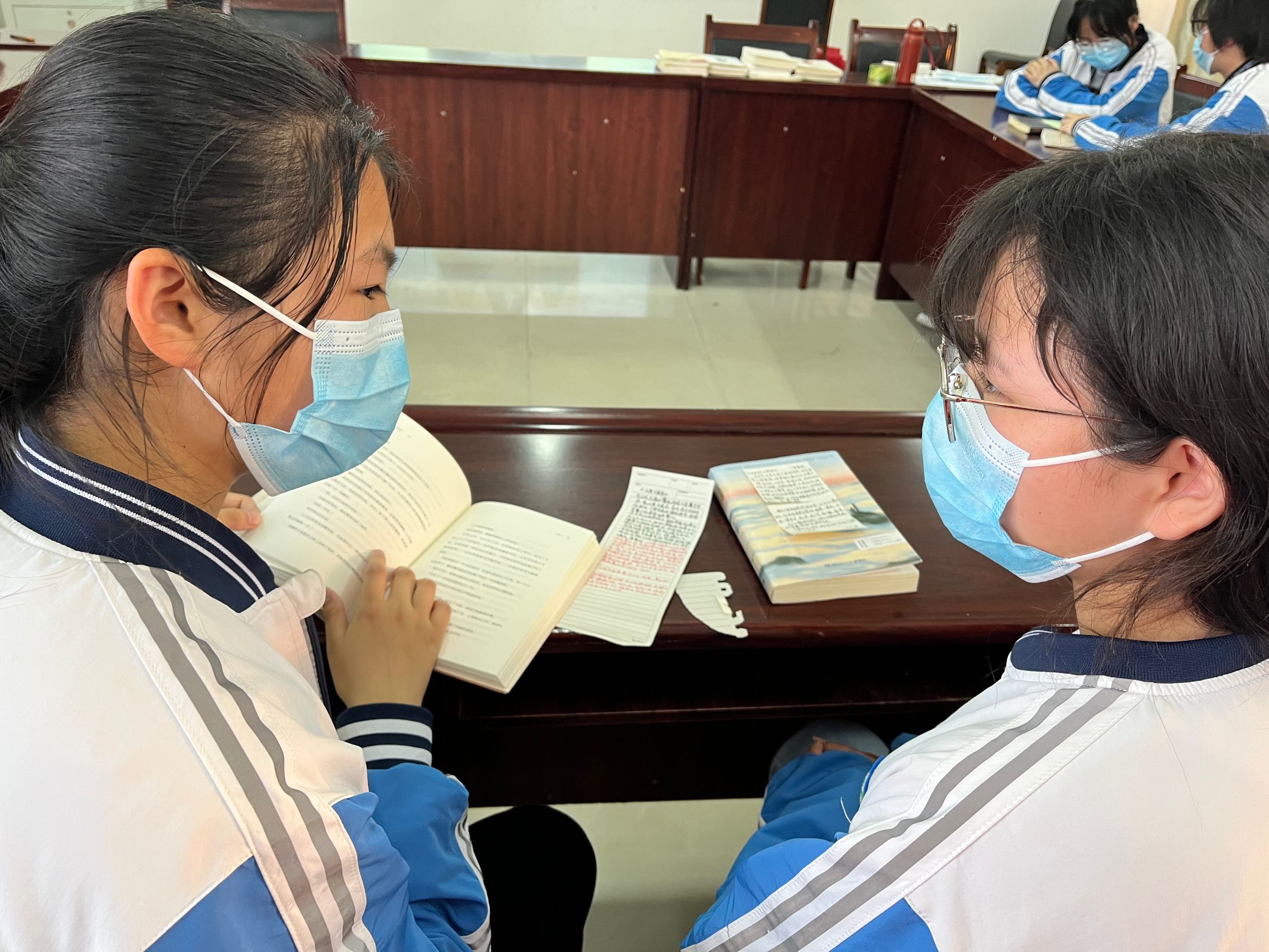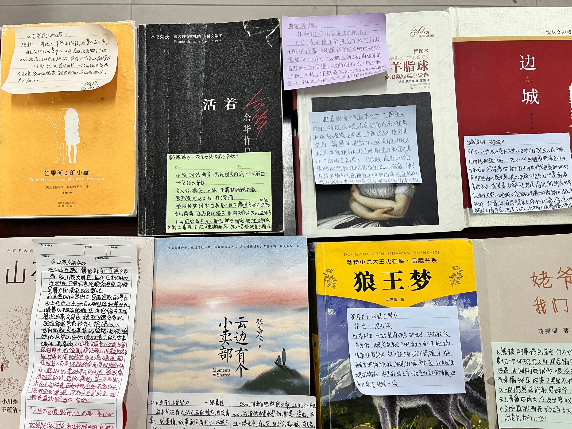 不知不觉中,活动进入压轴环节。同学们拿出活动前准备好要分享的书,认真写下分享理由、读后心得等粘贴在书本的扉页,并一一摆放整齐。接着,同学们展开积极讨论,交换着书籍,分享着感悟,交流着,互动着,分享着。有的积极高亢,有的深沉低语,有的手舞足蹈……完全沉浸在彼此分享的书籍中、文字中。学生们如此认真、忘我,使指导教师也情不自禁地加入其中,和学生一起讨论交流。自由的交流,思想的碰撞,像一场头脑风暴,产生了巨大的化学反应。