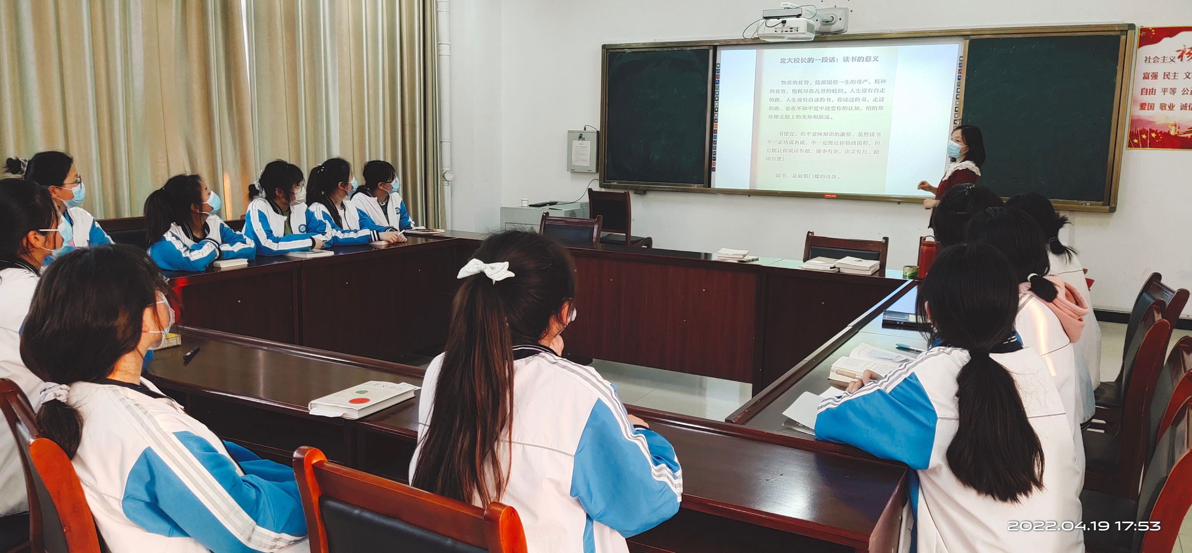 紧接着,指导教师通过图片展示和视频播放的方式,分享了关于读书的名人名言和励志故事。同学们认真聆听、专注观看,沉浸其中,深受触动,纷纷表示要多读书,好读书,读好书。