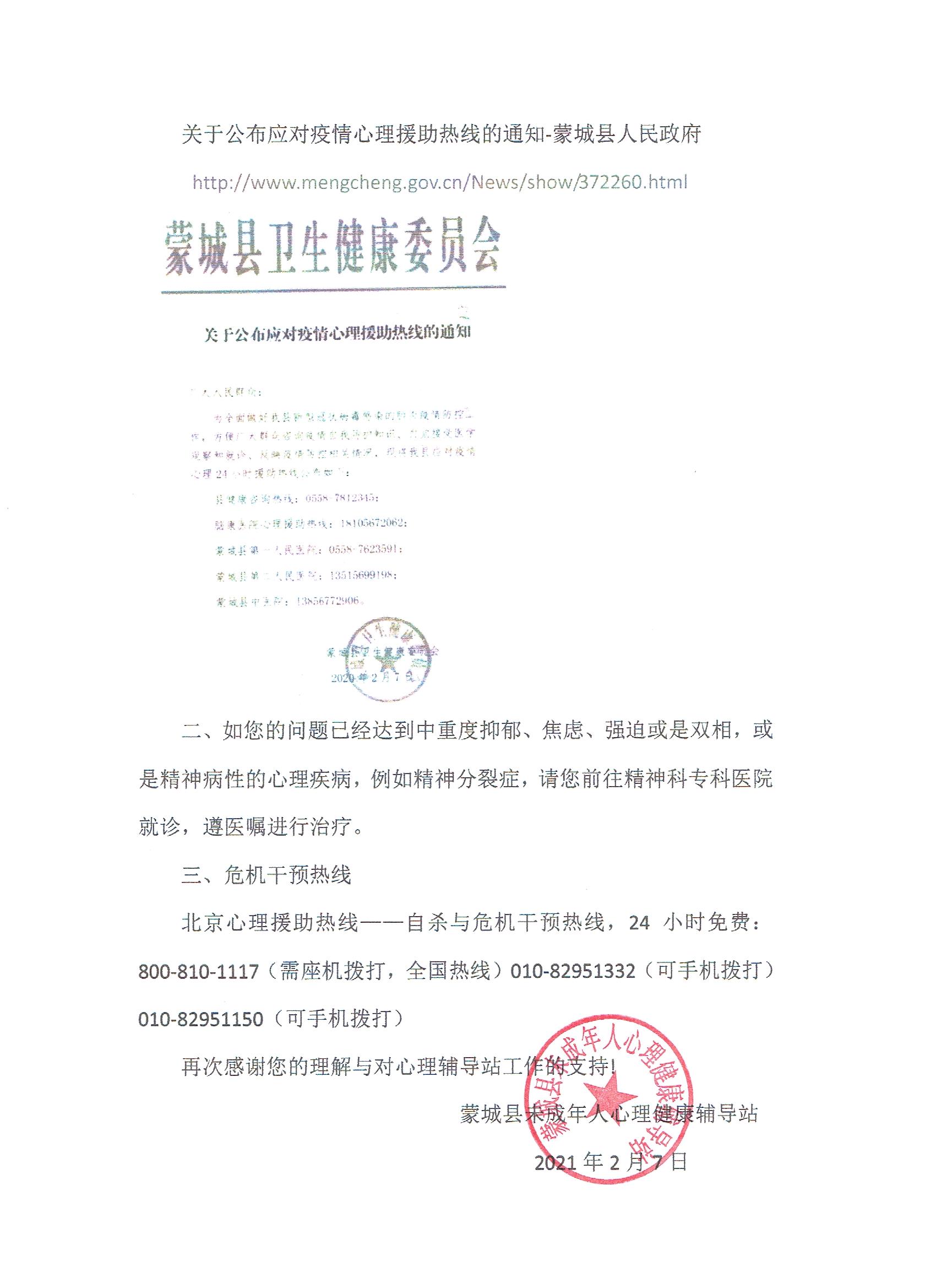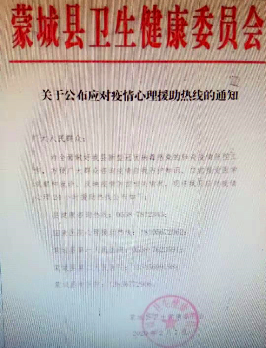 关于公布应对疫情心理援助热线的通知-蒙城县人民政府