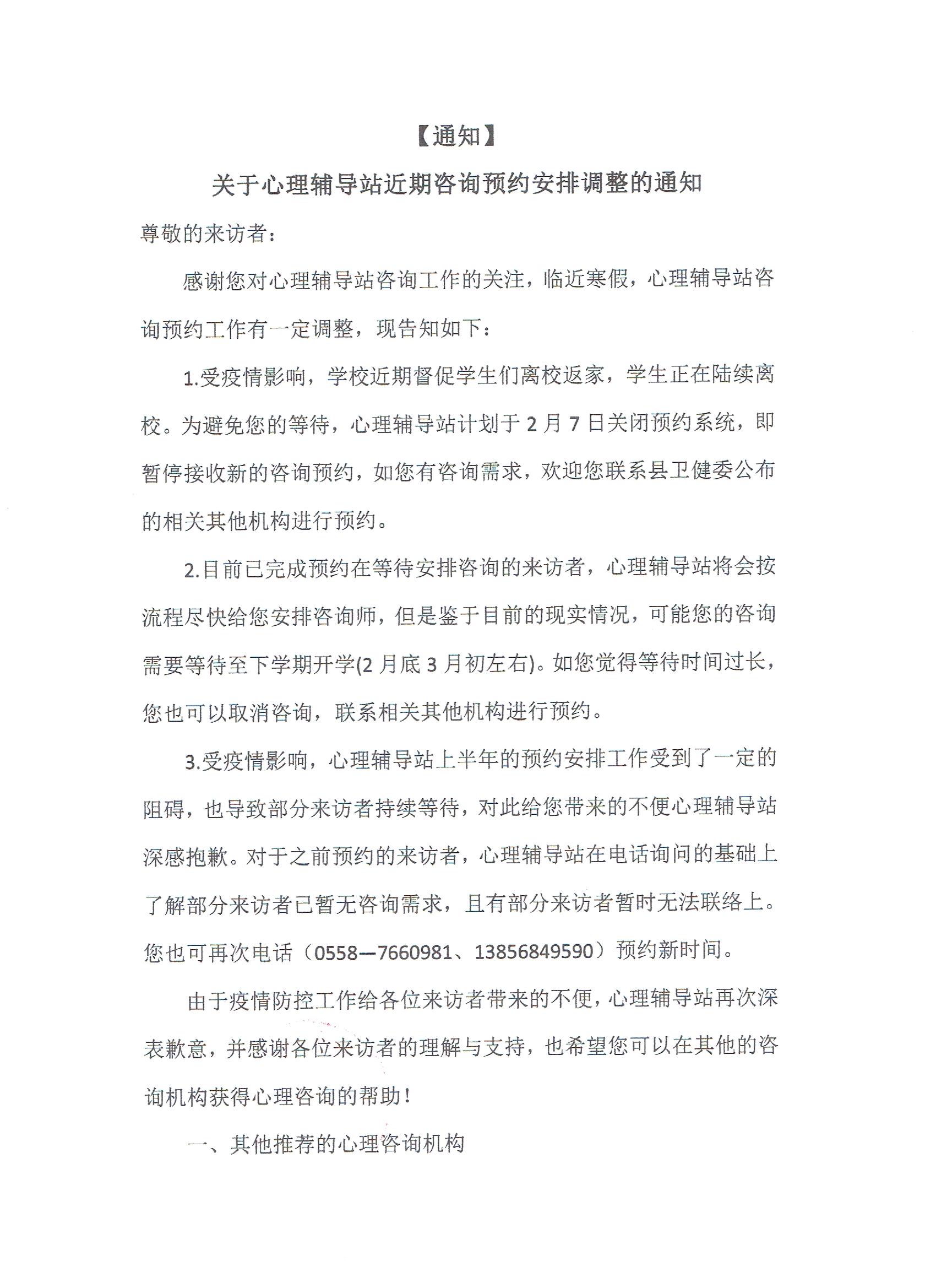 1.受疫情影响,学校近期督促学生们离校返家,学生正在陆续离校。为避免您的等待,心理辅导站计划于2月7日关闭预约系统,即暂停接收新的咨询预约,如您有咨询需求,欢迎您联系县卫健委公布的相关其他机构进行预约。