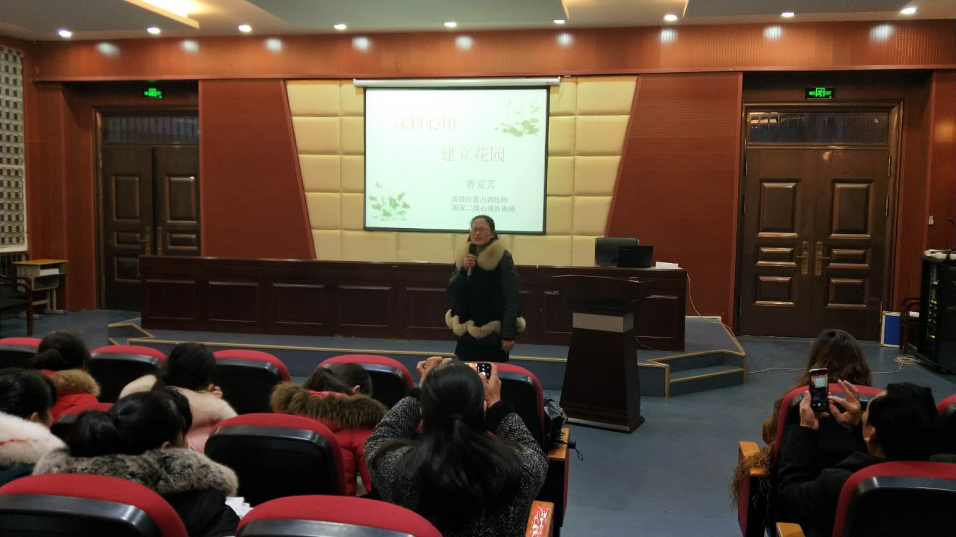 “深耕心田,建立花园”的目标是做有品格的教师,育有品质的学生。报告又从家长、学生、同事、朋友和“我”之间的关系讲述了人与人之间的关系不单指人与人之间的静态的必然关系,它更强调人与人之间的情感关系、行为的互相影响。曹老师分别通过鱼缸理论、双圈理论生动形象的对如何处理好师生之间的关系,如何处理好老师和家长之间的关系做了非常细致的分析,解剖。教师又是心理健康教育工作者,要用爱的目光注视孩子、要用爱的微笑面对孩子、要用爱的心情倾听孩子、要用爱的语言鼓励孩子,关注心理健康、关注精神卫生、消除歧视和偏见、预防学校欺凌与暴力、早期识别和干预。