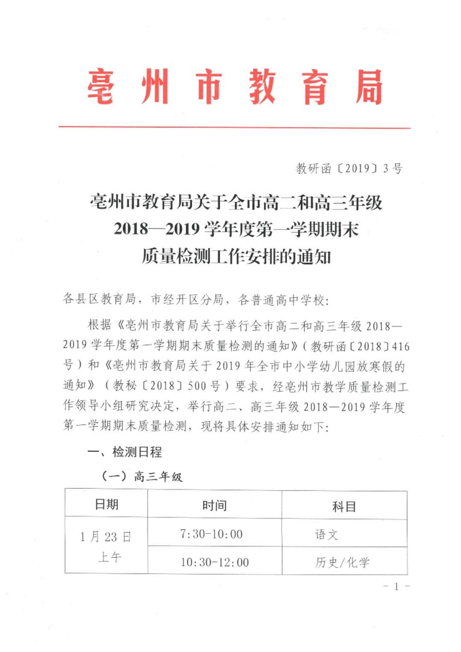 亳州市关于全市高二高三年级2018-2019学年度第一学期期末质量检测工作安排的通知 发布时间:2019-01-14 12:21:10 浏览次数: 次 字体:小 大 打印 分享到: 扫一扫在手机打开当前页